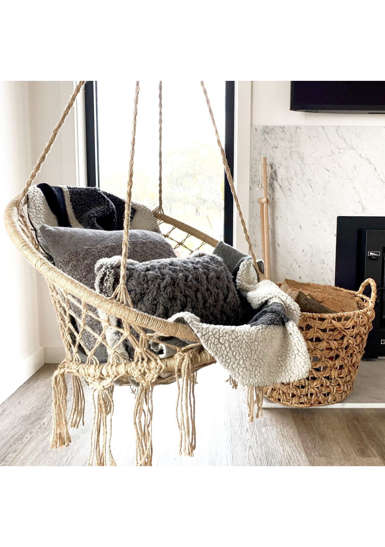 These Brazilian designed macrame hammock chairs are hand crafted to the highest quality. Create a relaxing space, choose a tree or the verandah out the back with a specially positioned weight baring "S" hook and we just know you'll have a good time. Setup is as easy as installing a screw hook into a wooden beam, attaching a tree strap to a strong branch, or hanging it from a stand. Hanging kit sold separately.Need help hanging your new hammock chair? Click Here Features: Brand Ivory & Deene Style Madrid Colour Natural Rope Size Seat Diameter 60cm Back Rest Circle Diameter 80cm Back Rest Height 45cmHeight 135cm Included Hammock + Top Rings Material Rope Maximum Weight 120kg Notes - Sturdy macrame ropes.- Approximate weight of 3.7 kg.- Cushions and accessories are not included.- Hang it in your backyard, patio or courtyard by its O ring.