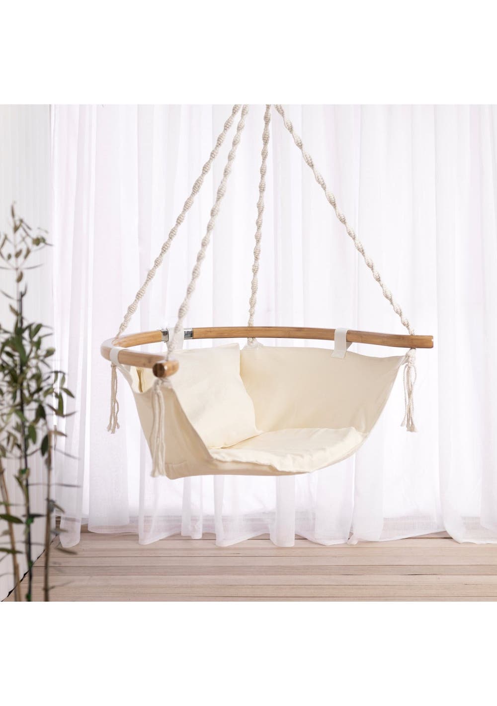 Enjoy the outdoors in comfort with this stylish Montego hammock chair. Ideal to hang indoors or outdoors using a hanging kit or rope from a sturdy beam. Matching cushion is included creating a comfortable, stylish and inviting padded seat for yourself or your visitors. This hammock chair is easy to put together with the simple push-button assembly. Hanging kit is sold separately. Please Note: These are reduced due to the internal seat padding not unfolding right away. The padding should even out with use. Features: Brand Ivory & Deene Style Montego Colour Cream Size Approx. 115cm x 75cm Included Hammock Chair and Cushion Fabric Linen and Wood Maximum Weight 140kg Notes - Hanging kit sold separately- Cushion is included- Approximate weight of 5.0 kg