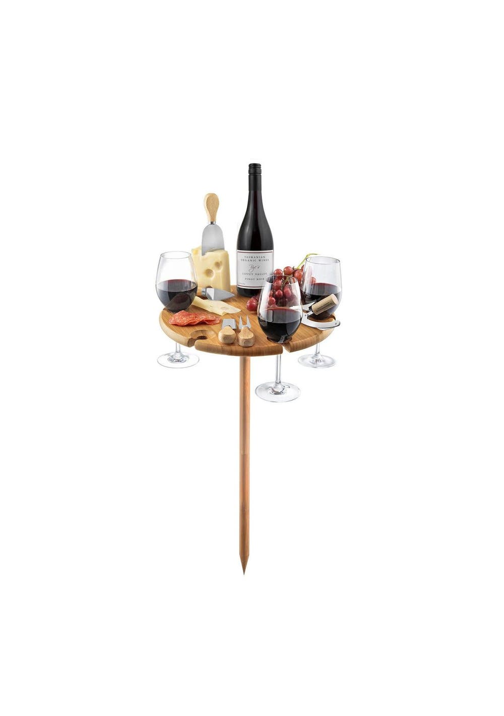 This unique wine and cheese round picnic table range is the ideal gift for that ‘impossible to buy for person who already has everything’. They are also ideal for a romantic couple, as a wedding gift, or to commemorate a birthday or anniversary. The collapsible design of our cheese board allows you to set it up in minutes without ever using any tools. Under the main surface, you will find all the cutting tools on the hide-away cut out sections. Simply place it on the hanging support on the side so everyone can slice cheese and self-serve. Secure your wine and cheeses while enjoying the outdoors with your favourite people. Comes complete with black vegan leather handle for ease of transport and the board is cleverly designed with cut-outs to stand up to 6 wine glasses. And when its time to pack up, just unscrew the stand and clip into the back of the board for compact and easy transporting and storage. Features: Brand Ivory & Deene Style Gourmet Picnic Table Colour Natural Dimensions 56cm height x 33cm width x 33cm depth Approx. 2kg Type Portable Material Bamboo Included Matching cheese knives and a wine bottle opener