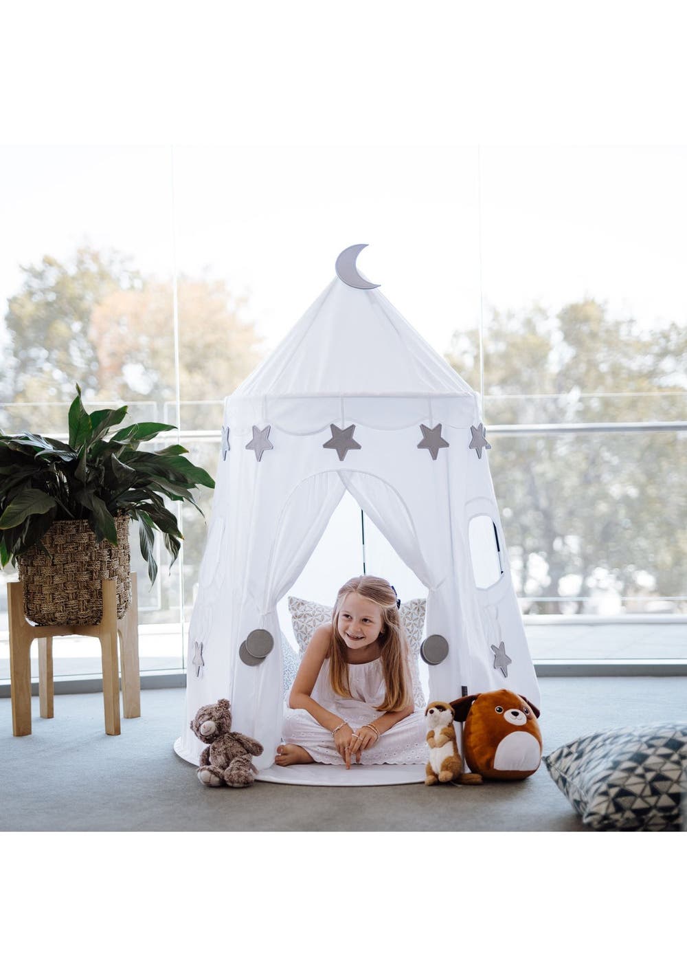 Your kids will enjoy hours of fun playing in their easy pop up play tent/cubby house ...there are so many options for imaginative play. They can tuck themselves away for quiet time with a book, play with their toys, have a party, or play a game of cowboys and indians - any kind of play imaginable! Fantastic for use all year round, both inside and outside. Create a special feel in any corner of a bedroom or deck, or take with you to play at the park, garden or beach. An ideal gift for any age, from babies and toddlers to kids and tweens.Setup takes just minutes and then they can be moved easily from room to room, house to car, car to beach - anywhere - as it's so light and easy to store away.Great quality, generous size, wipe clean material and complete with stars and moon, plus a window for gazing. Features: Brand Ivory & Deene Style Play Tent Colour White/Grey Size Approx 150cm height x 110cm diameter Fabric Easy Care Polyester Window Yes