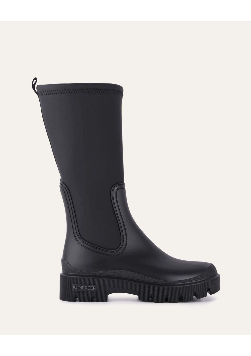 Stay dry in style this season with MINK. Designed with a sense of modernity, they are made from rubber with a stretch material and tracked sole that provide a striking, yet minimal profile. Style yours with cropped hemlines to show off MINK or tighter pants for a layering piece. Specifications - Rain boot- Rubber boot- Rubber sole- Stretch 3/4 calf rain boot- Softly rounded toe Heel height: cm Upper: Non-leatherLining: Non-leatherSole: Non-leather