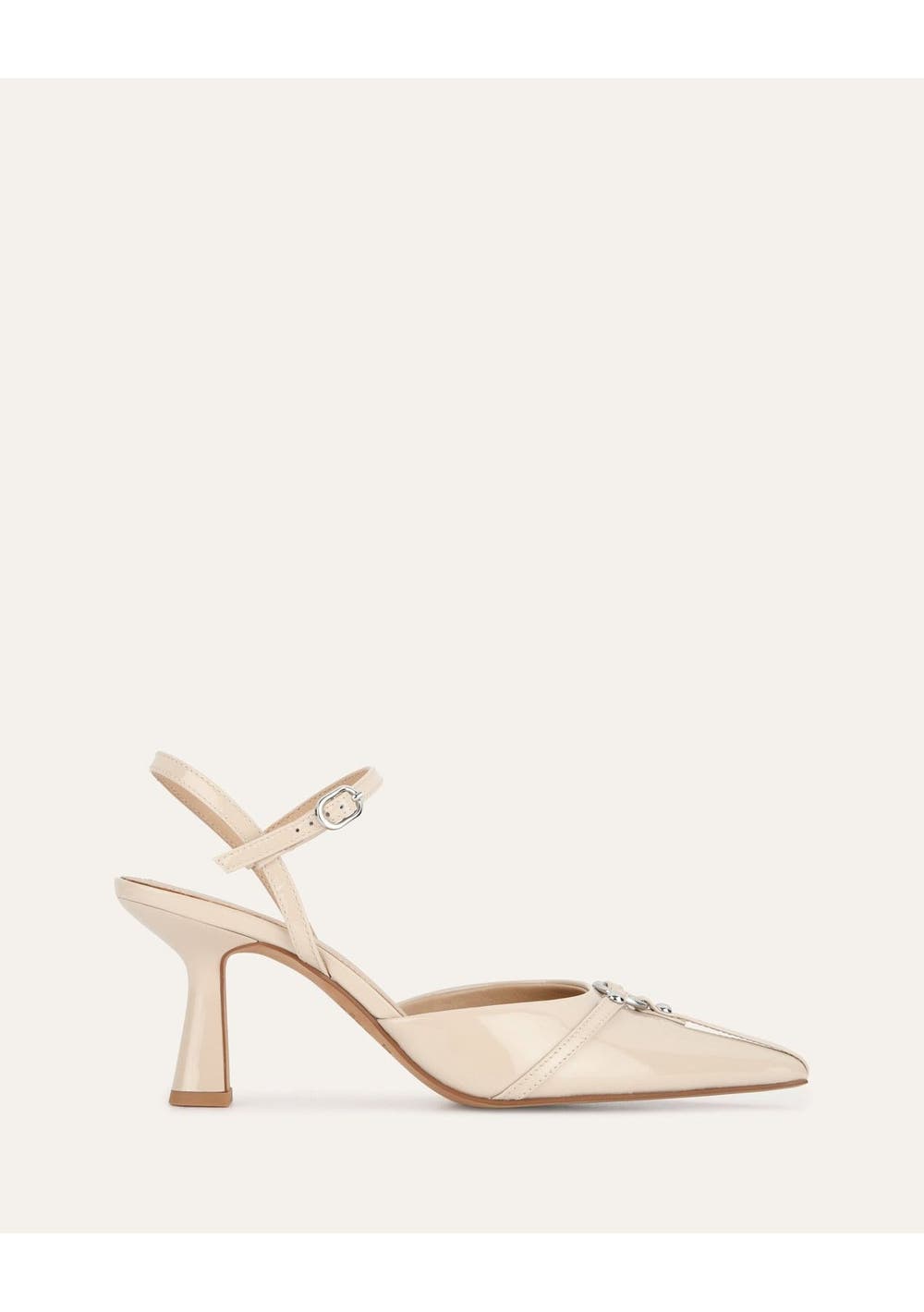 Discover the hardware of the season with YURI. Featuring a rounded silver buckle with three rounded studs, chic pointed toe shape and patent finish will have you reaching for YURI from day to night. Style YURI with silver hardware and cropped hemlines to showcase the vamp detailing. Specifications - Sling back heel- Patent leather- Wrapped leather high heel- Adjustable buckle- Pointed toe shape- Rounded edge buckle- Round silver trim with 3 rounded studs Heel height: 8cm Upper: LeatherLining: LeatherSole: Non-leather