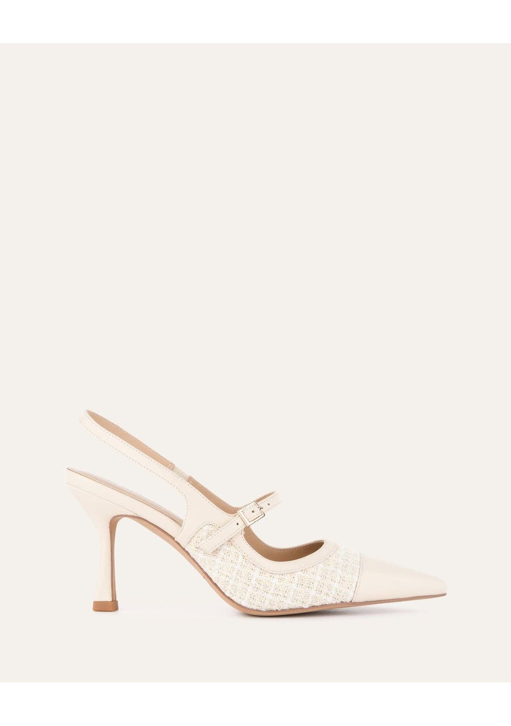 Re-discover the classic textures of tweed with ASCOT. The pointed toe shape sling back is set on a stiletto high heel with kid leather detailing. Style yours with your favourite denim for a more casual look or a structured dress for a more formal approach. Specifications - High heel- Pointed toe shape- Shiny light gold metal- Stiletto- Kid leather- Sling back Heel height: 9cmUpper: Leather & non-leatherLining: LeatherSole: Non-leather sole