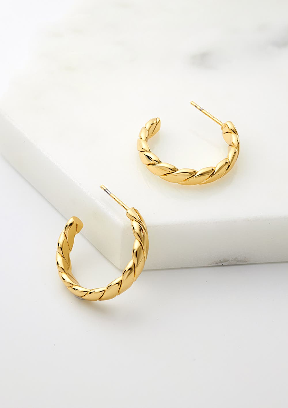 These hoops feature a classic design with a braided detail, adding a subtle and sophisticated element to the overall look. Crafted with attention to detail, the Chelsea Hoop Earrings are made to be durable and comfortable for everyday wear. Their versatile style makes them perfect for any occasion, whether you're dressing up for a special event or keeping it casual for everyday activities. Made Nickel Free Hypoallergenic brass metal 18k Gold Plated Earring Size is 5mm (W) x 22mm (L) Measured at the widest width and overall length Water resistant