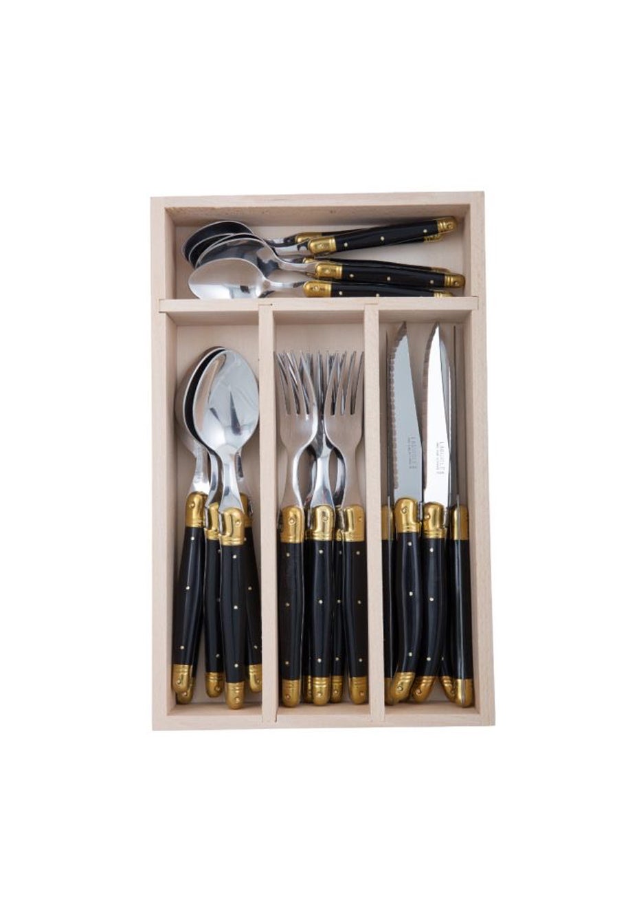 Enhance your dining experience with this beautiful and versatile 24-piece cutlery set. Set contains 6 each of spoons/teaspoons/forks/serrated knives featuring trademark welded bee. Full tang mirror-polished stainless steel with black/gold handles. European beech wood giftboxes. More Information COLOUR Stainless Steel/Black/Brass Size 6 Spoons 23.5cm/6 Forks 21.5cm/6 Knives 23.5cm/6 Tsp 16.5cm/GB 32x20x5cm WHAT’S IN THE BOX 6 x Spoons 6 x Forks 6 x Knives 6 x Teaspoons 1 x European Beechwood Box Material Composition Made from stainless steel and plastic. Extra Features This set contains 6 each of spoons/teaspoons/forks/serrated knives featuring trademark welded bee. Full tang mirror-polished stainless steel with black/gold handles. European beech wood giftboxes. Country Of Origin Made in France. Packaging Key Gift Box