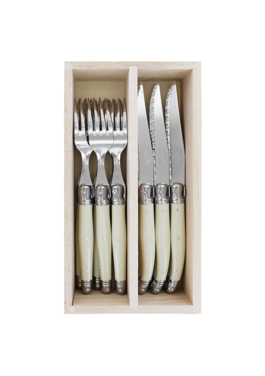 This classic, 12 piece cutlery set contains 6 forks and 6 serrated knives in a stylish, divided beechwood gift box with dovetail joinery. Each piece features the trademark welded Laguiole Bee. The mirror polished stainless steel cutlery is full tang, with ivory coloured handles that will complement any table setting. Andre Verdier is one of France's oldest cutlery manufacturers, producing 100% made in France Laguiole pieces. COLOUR Stainless Steel/Ivory Size 6 Forks 21.5cm/6 Serrated Knives 23.5cm/GB 27x13x6cm WHAT’S IN THE BOX 6 x Forks 6 x Knives 1 x European Beechwood Box Material Composition Made from stainless steel and plastic. Extra Features Set contains full tang mirror-polished stainless steel cutlery including 6 forks and 6 serrated knives with the trademark welded bee. Ivory-coloured handles. Comes in European beech wood gift box. Country Of Origin Made in France. Packaging Key Gift Box