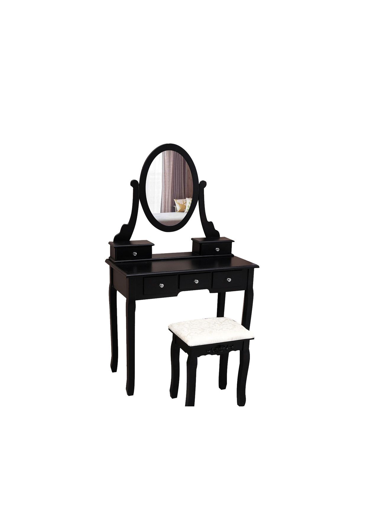 PR9303 - Everett Dressing Table Set Black With 2 small drawers and 3 big drawers under the dressing table, Everett Dressing Table Set offers sufficient space to hold your cosmetics, jewelry, ornaments, hairdressing utensils, and other accessories. Made of quality wood and MDF, this sturdy vanity dressing table will meet your long-term needs and decorate your home all the time. The large mirror with elegant lines reflects your style before heading out for a date. And the stool has a really comfortable top. When you are sitting on it and dressing yourself, you will feel that it's really an enjoyment. FeaturesElegant and modern designMade of wood and MDFSturdy and durable Smooth and spacious tabletop5 storage drawers Cushioned StoolCurved legs Assembly requiredSpecificationsColor: BlackMaterial: MDF + WoodTable size: 79 x 40 x 136.5 cmStool size: 37 x 28 x 44 cmHeight of the table top: 70 cm