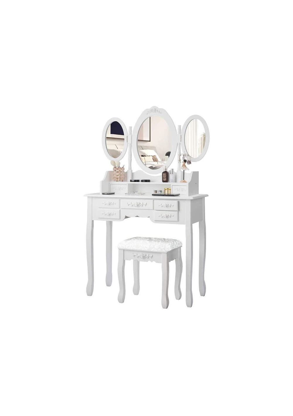 PR8030-Ktaxon Dressing Table Set WhiteIt is in classic white color, which makes it look compact. It can be a fine display of your room. This dressing table set includes a mirrored dressing table with seven drawers and a stool. One of the biggest characteristic of this dressing table set is that it has three mirrors. How special it is! You can well make yourself up in front of them. Two 180°folding mirror and a center mirror help you view your hair from multiple angles. And the stool has a really comfortable top. When you are sitting on it and dressing yourself, you will feel that it's really an enjoyment. A lot of things such as makeup, jewelries, accessories and ornaments, can be stored in the storage drawers and the spacious table top. FeaturesFlower-carving vanity table Elegant and modern designMade of wood and MDFSturdy and durable 3 Adjustable mirrors Smooth and spacious table top7 storage drawers Cushioned StoolCurved legs Assembly requiredSpecificationsColor: whiteMaterial: MDF + WoodTable size: 90 x 40 x 144.5 cmStool size: 38 x 28 x 45 cmHeight of the table top: 77 cm