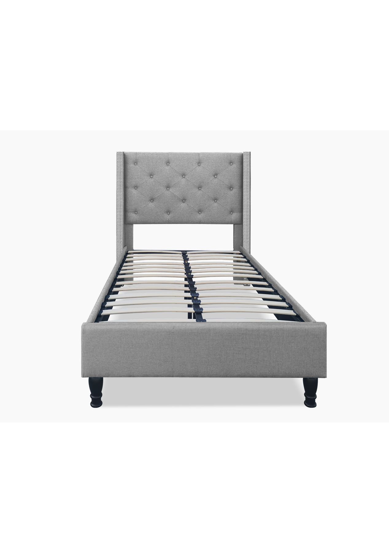 PR10152 New Lisbeth Fabric Bed Frame King Single GreyYour good mattress certainly deserves an equally fine bed frame. This new luxurious fabric Lisbeth bed frame will give your room an elegant touch of style. The bed comes with a dashing tufted headboard that also includes metal studded detailing on the sides of the bed that gives a modern twist to the classy design. It features a curved slat base providing a great degree of comfort. The natural bounce on the slats adjusts to your sleeping profile. Surely it will provide anyone with a restful night.This listing is for the Bed frame only. Mattress NOT included.FeaturesElegant designUpholstered in quality fabricTasteful tufted headboard detailingClassy studs on headboard sidesWooden flexi slatsFits a standard King Single MattressSpecificationColor: GreyOverall size: 220x126x129cmHeadboard height: 129cmFootboard height: 38.5cmSimple assembly requiredWeight Limit including Mattress - 250kg It comes in 2 boxes.Packaging Dimensions: BoxA: 117x73x11CMBoxB: 212x34x25CM