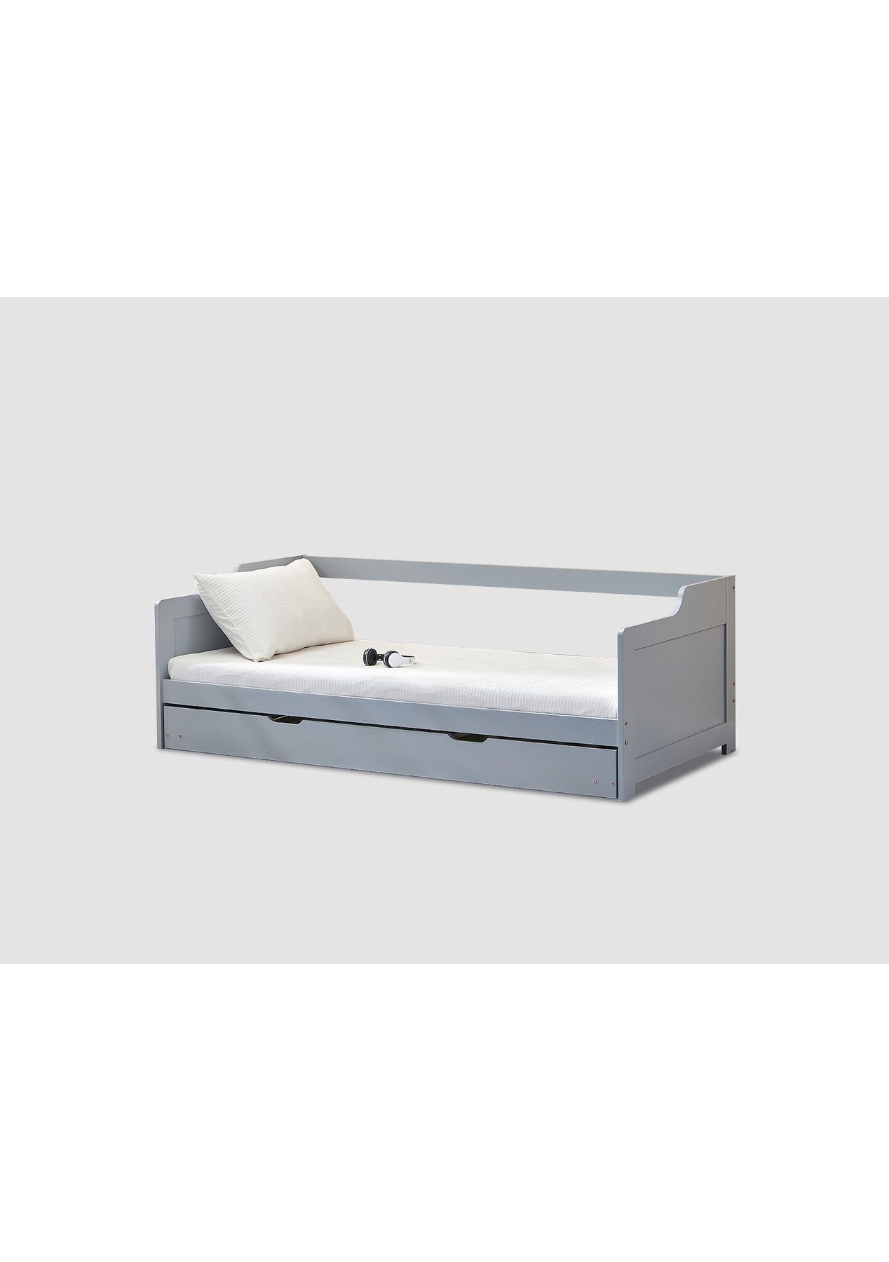 PR6143-Kovert Daybed with Trundle GreyWhether you want two single beds or a sofa and a bed, the choice is yours with the Kovert Daybed. The frame and slats are each crafted with pine wood to provide durability and stability. Furthermore, the foldable trundle bed offers an extra bed for guest and it is convenient to store under the normal bed when not in use. The stylish and neutral design will add a sense of simplicity into your home and match a wide variety of bedding ensembles and pillows.FeaturePine Wood FrameStable and Sturdy ConstructionPlywood SlatsTrundle BedSpace-savingSmooth Finish EdgesSpecificationMaterial: Pine WoodColor: GreyDimension: Fit in 190*91cm MattressAssembly Required. ***Please note that the listing is only for the bed frame only***