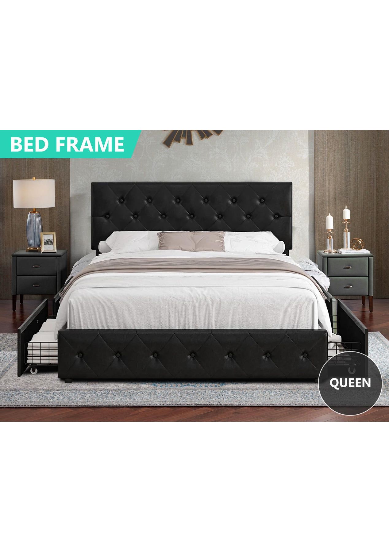 PR8982- Norian Metal Storage Bed Frame PU Queen BlackStyle your bedroom with our Norian Metal Storage Bed Frame! This well-designed bed frame is a perfect expression of fashion and functionality. Crafted in a modern style with sleek lines and graceful button-tufted patterns, the bed frame exactly interprets elegance and sophistication, ideal for contemporary and traditional room styles. The frame of the bed is made with sturdy metal that includes a strong wooden slat system as well as solid metal rails in the center, ensuring a long life span. The headboard height is adjustable to suit different sizes of mattresses. With 4 large pull-out wire netting drawers at the base of the bed, you are provided with convenient storage compartments to keep your bedroom essentials. FeaturesContemporary designWrapped with faux leather Metal frame and wooden slatsAdjustable height headboardPlastic bed legsMetal middle support bars4 pull-out storage drawersFits 153x203cm mattressEasy assemblySpecificationsOverall size: 212 x 159 x 104.5cmDrawer size: 90 x 50 x 15cmColor: BlackCapacity: 300KG