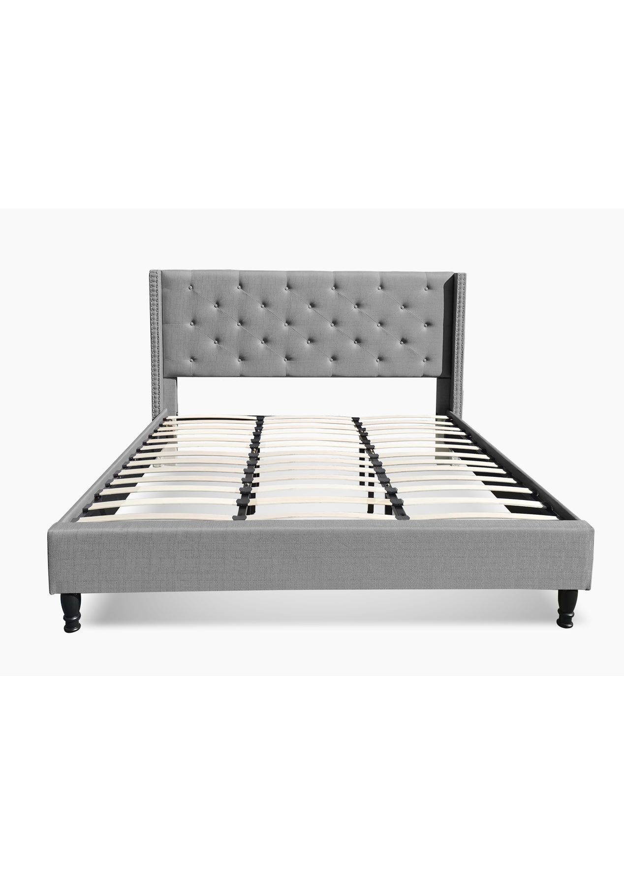 PR10158 New Lisbeth Fabric Bed Frame Super King GreyYour good mattress certainly deserves an equally fine bed frame. This new luxurious fabric Lisbeth bed frame will give your room an elegant touch of style. The bed comes with a dashing tufted headboard that also includes metal studded detailing on the sides of the bed that gives a modern twist to the classy design. It features a curved slat base providing a great degree of comfort. The natural bounce on the slats adjusts to your sleeping profile. Surely it will provide anyone with a restful night.This listing is for the Bed frame only. Mattress NOT included.FeaturesElegant designUpholstered in quality fabricTasteful tufted headboard detailingClassy studs on headboard sidesWooden flexi slatsFits the standard Super King MattressSpecificationColor: GreyOverall size: 220x202x129cmHeadboard height: 129cmFootboard height: 38.5cmSimple assembly requiredWeight Limit including Mattress - 350kg It comes in 2 boxes.packaging Dimensions: boxA: 193x73x11CMBoxB: 211x25.5x17.5CM
