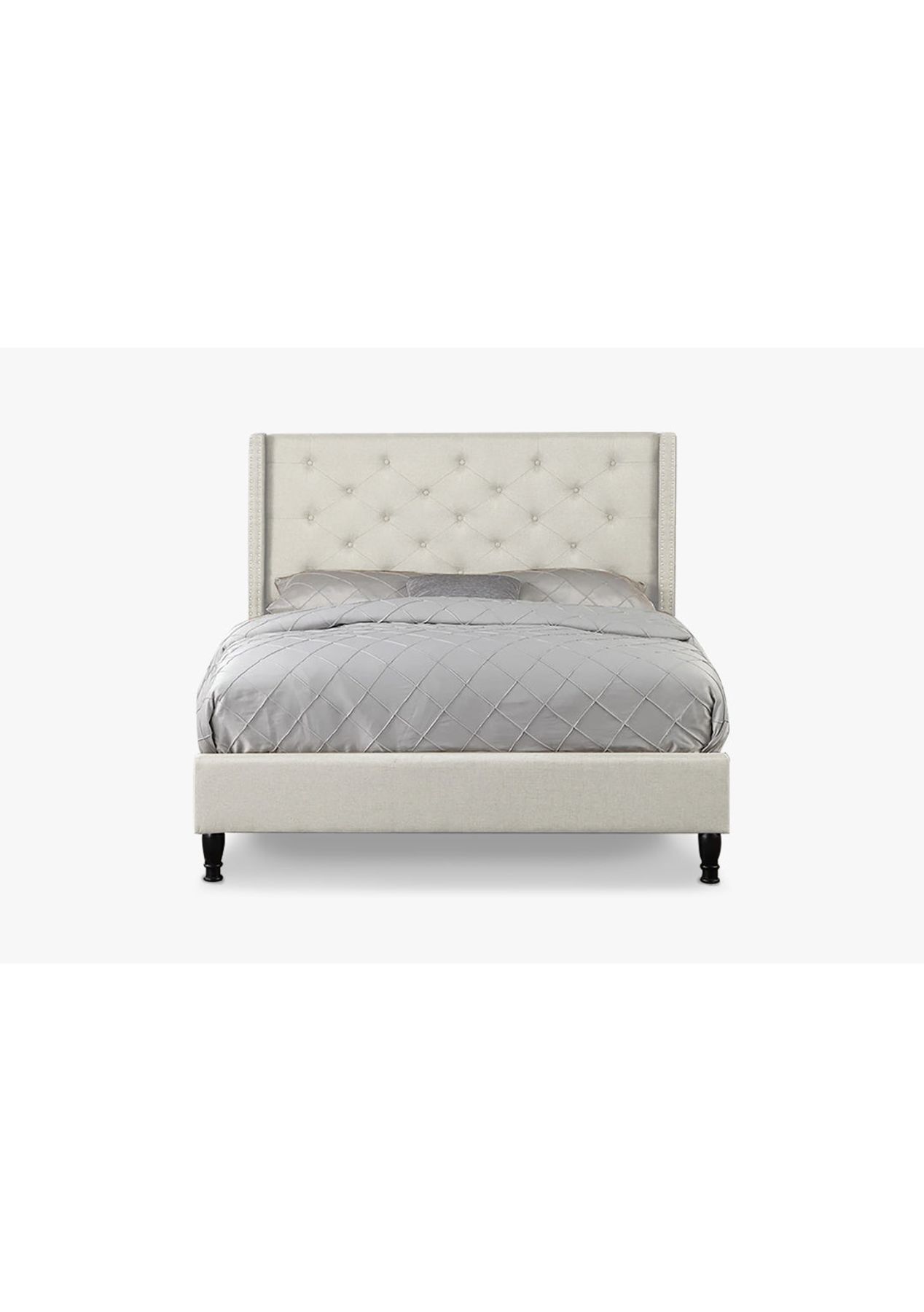 PR6665518 - T New Lisbeth Fabric Bed Frame Queen Beige This new luxurious fabric Lisbeth bed frame in queen size will give your room an elegant touch in style. The bed comes with a dashing tufted headboard that also includes metal studded detailing on the sides of the bed that gives a modern twist with the classy design. Queen sized Mattresses fit perfectly to this bed as it includes strong supportive flexible slabs that will provide anyone with a restful night.Features:- simple design with an elegant tufted detailing- The bed comes with flexible slats for that extra comfort - The panels of the bed have wood inside and a beautiful fabric on the outside giving it that elegant look.- Fits a standard Nz queen Mattress.- Color: Beige- Simple assembly requiredoverall size: 220x160x129cmheadboard height:129cmfootboard height:39cm Height from Floor to Base: 14cm Weight Limit including Mattress - 300kg ***Please note that the listing is only for the bed frame only*** It comes in 2 boxes.Packaging Dimensions: BoxA: 163x73x12CMBoxB: 212x26x18CM