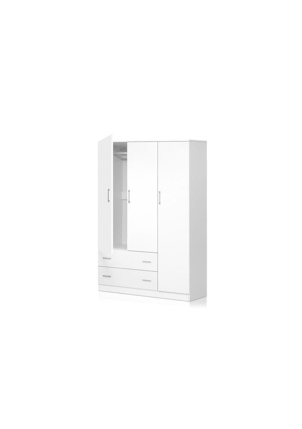 PR6359 - Klader Wardrobe L114 Featuring a durable 15mm thick particle board and MDF with melamine finish, our Klader Wardrobe is a stylish addition to any home. The wardrobe has ample storage space with a large double-door compartment and one single-door full-length compartment (with aluminium hanging rails included for both) for all your tall clothing such as coats and dresses, and two spacious drawers on the bottom for other smaller pieces of clothing and fashion accessories. It has a simple and modern design with sleek aluminium handles that will blend in easily with the dcor of your bedroom or dressing room. The wardrobe also features horizontal backboards for extra support, anti-rust drawer runners, heavy-duty hinges and anti-slip base so that it will last for many years to come. Features3-door wardrobeTwo drawersTwo hanging areasOne Full-length cabinetAmple storageReinforced constructionSturdy and durableAluminium hanging rails includedAluminium handlesHeavy-duty hingesAnti-rust runnersAnti-slip baseEasy assemblySpecificationsMaterial: 15mm thick particle board + MDF Finish: Melamine Overall dimensions: 114cm x 50cm x 170cm Color: White It comes in 3 boxes.Packaging Size: BoxA: 180x57x9CMBoxB: 171.5x57x9.5CMBoxC: 142x59.5x12CM