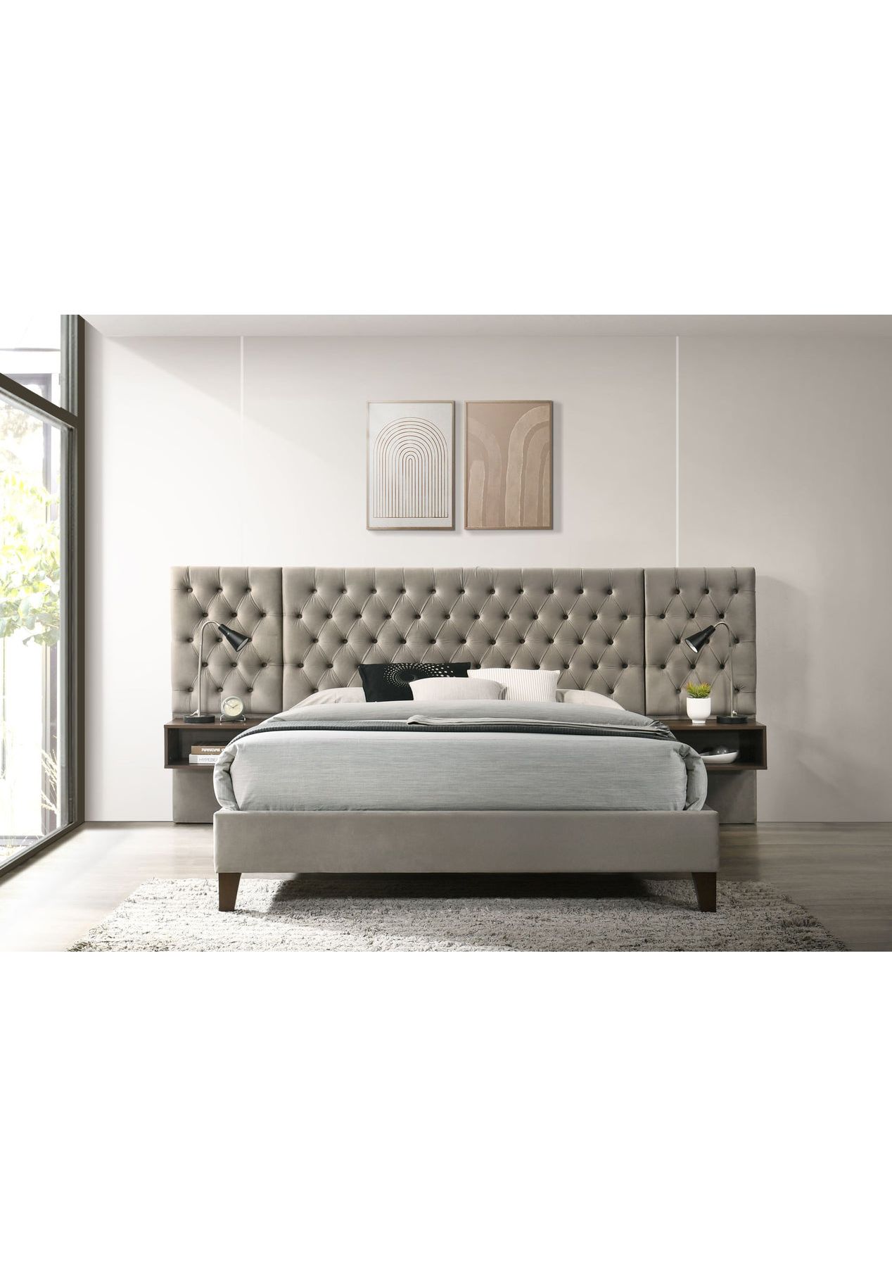PR11438 Amara Velvet Bedframe KingThis classic-meets-contemporary design Amara bed features a fully upholstered bed frame with classic velvet fabric and a tufted headboard to maximize bed comfort. The two wings of the headboard extend outward, giving it a luxurious and sophisticated look. It is both practical and beautiful paired with two floating bedside tables. Finally built with solid wood legs to complete its luxurious look. It will make a beautiful centerpiece for any bedroom, adding elegance and grandeur to your room.==Features==**Velvet upholstered headboard bed frame**Paired with two hanging bedsides**Elegant and grand design==Specifications==** Materials: Bedframe: MDF + particle board + solid wooden legs + fabric Bedsides: laminated particle board** Overall Size: 2800*2230*1220mm** King Size** Color: Light Brown** Bed Weight capacity: 300kgs** Bedside table weight capacity: 20kgs** Bedside table dimension: 48*30*20cm** Hanging table top height: 49.5cm, bottom height: 29.5cm It comes in 3 boxes.Packaging Dimensions: BoxA: 179.5x76.5x12CMBoxB: 213.5x32x20.5CMBoxC: 124x53x28CM