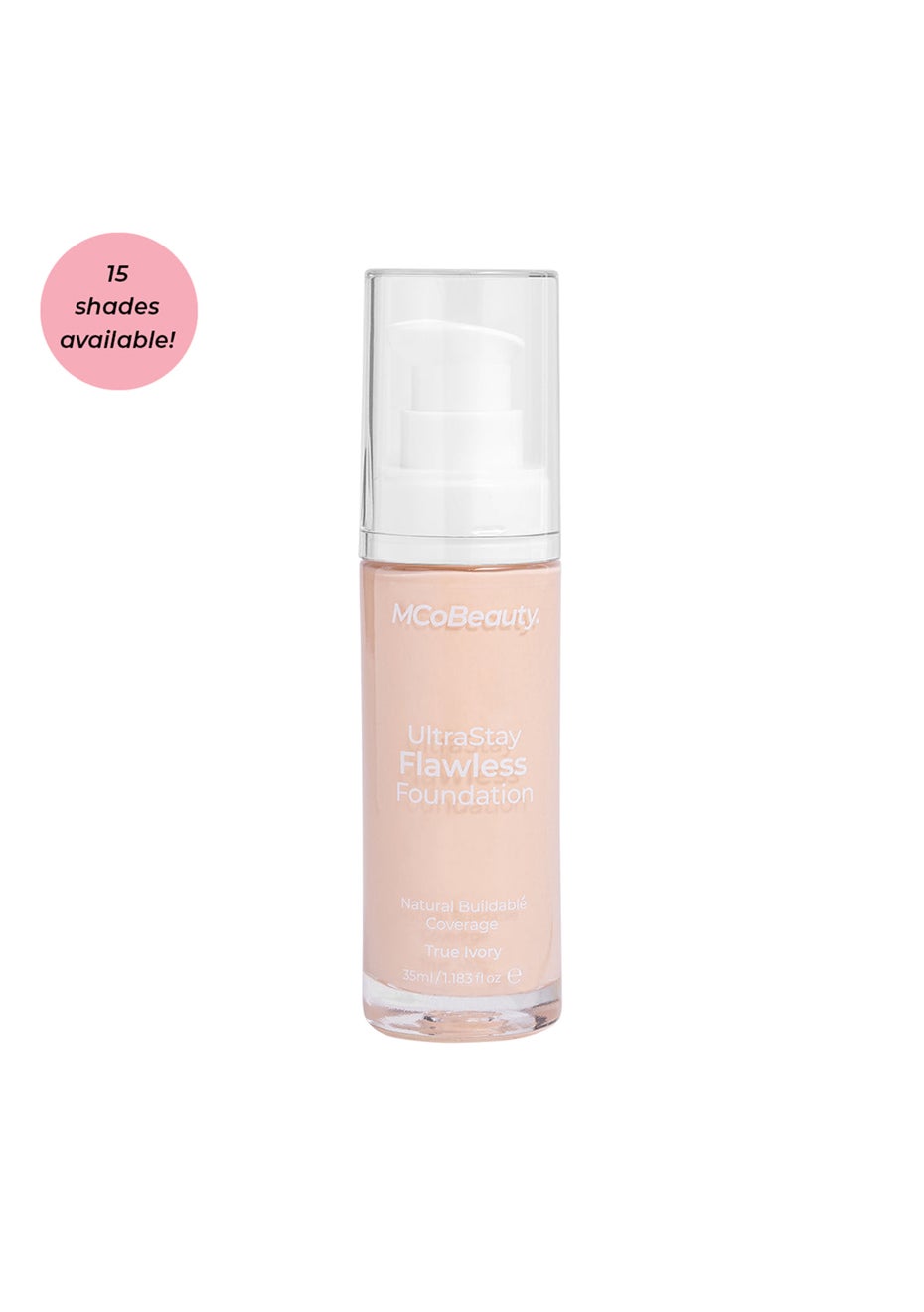 The MCoBeauty ULTRASTAY FLAWLESS FOUNDATION is a full coverage liquid foundation with a natural matte finish that offers buildable coverage that won't cake, fade or rub off. With ingredients like Chamomile and Gingseng Root Extract, skin feels nourished and revitalised.