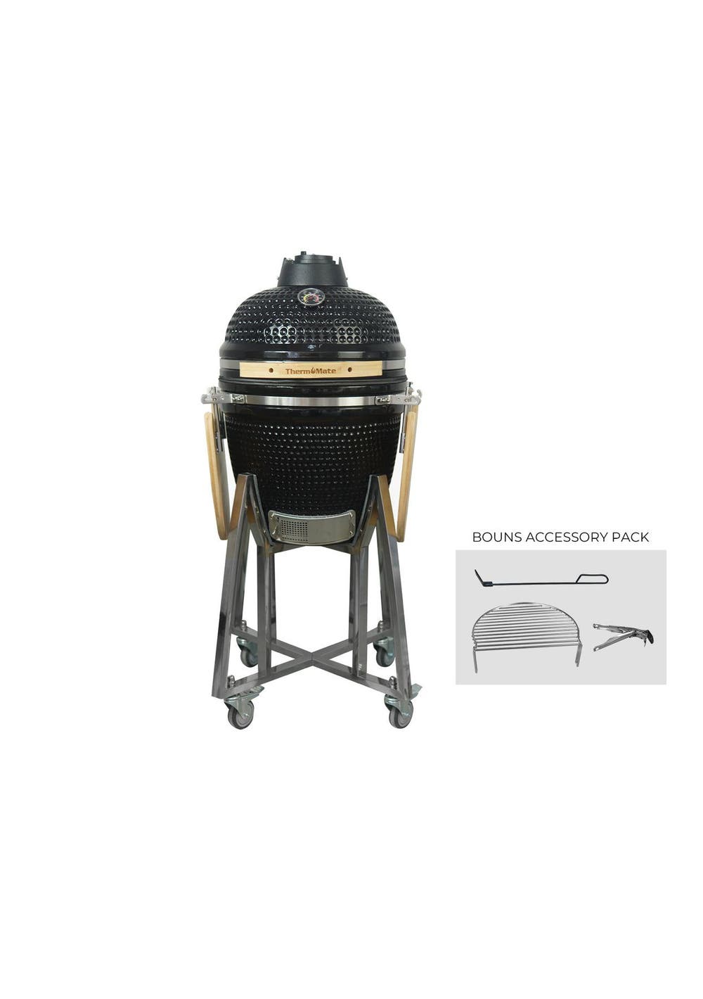 PR71967 - Kamado grill 18inch BlackElevate your backyard grilling experience with this kamado grill. This versatile ceramic charcoal grill offers a generous 171 square-inch cooking space, allowing you to grill, smoke, and even bake. Its robust ceramic construction ensures superior heat retention and even cooking, while the adjustable vent system allows precise temperature control for grilling, smoking, and baking. Adding to its convenience, the grill includes a built-in thermometer for easy monitoring and foldable, bamboo side tables for extra workspace. Experience outdoor cooking like never before with this kamado grill.FEATURESDurable and portable designCeramics heat deflectorPrecision temperature controlVersatile cooking optionsStrong support stainless steel standQuick and easy clean-upBonus accessory kit including rain cover, cooking grid expander, roast nets clip, ash toolSpecificationMain body Diameter: 18inchDia of a cooking grid: 38.3cmAssembled dimension(LxWxH): 121x65.5x108cmOperating height: 79.5cmColor: BlackN.W: 54KGTemperature resistance: 1000 degreesPackage: 2CTN