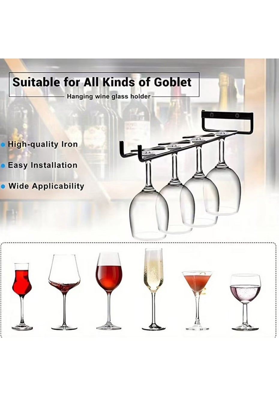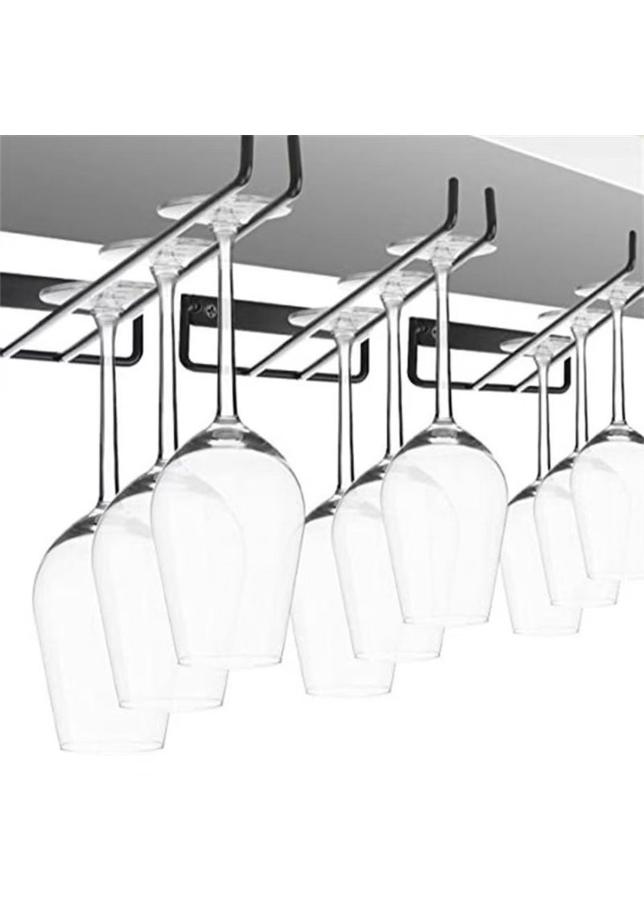 This 4 pack wall-mounted wine glass rack provides elegant and efficient storage for stemware. Its compact iron frame holds glasses upside down for drying and easy access, ideal for kitchens, bars, or dining areas.