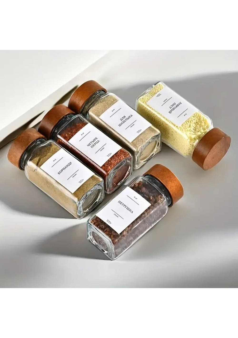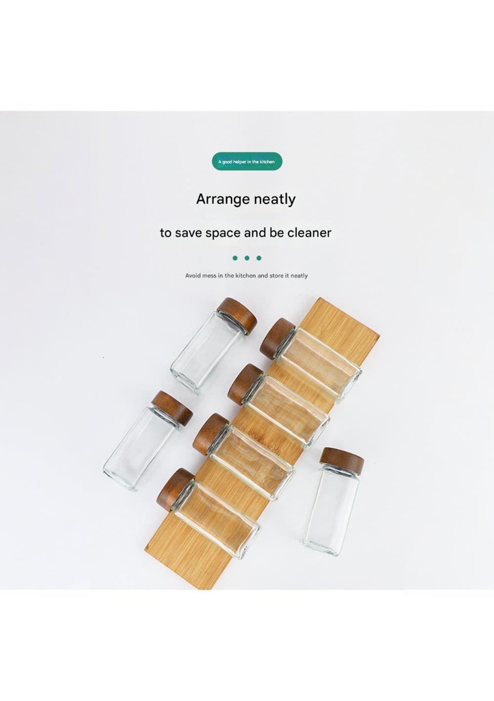 Set of 24 square glass spice jars with natural acacia wood lids, providing a stylish and functional storage solution.