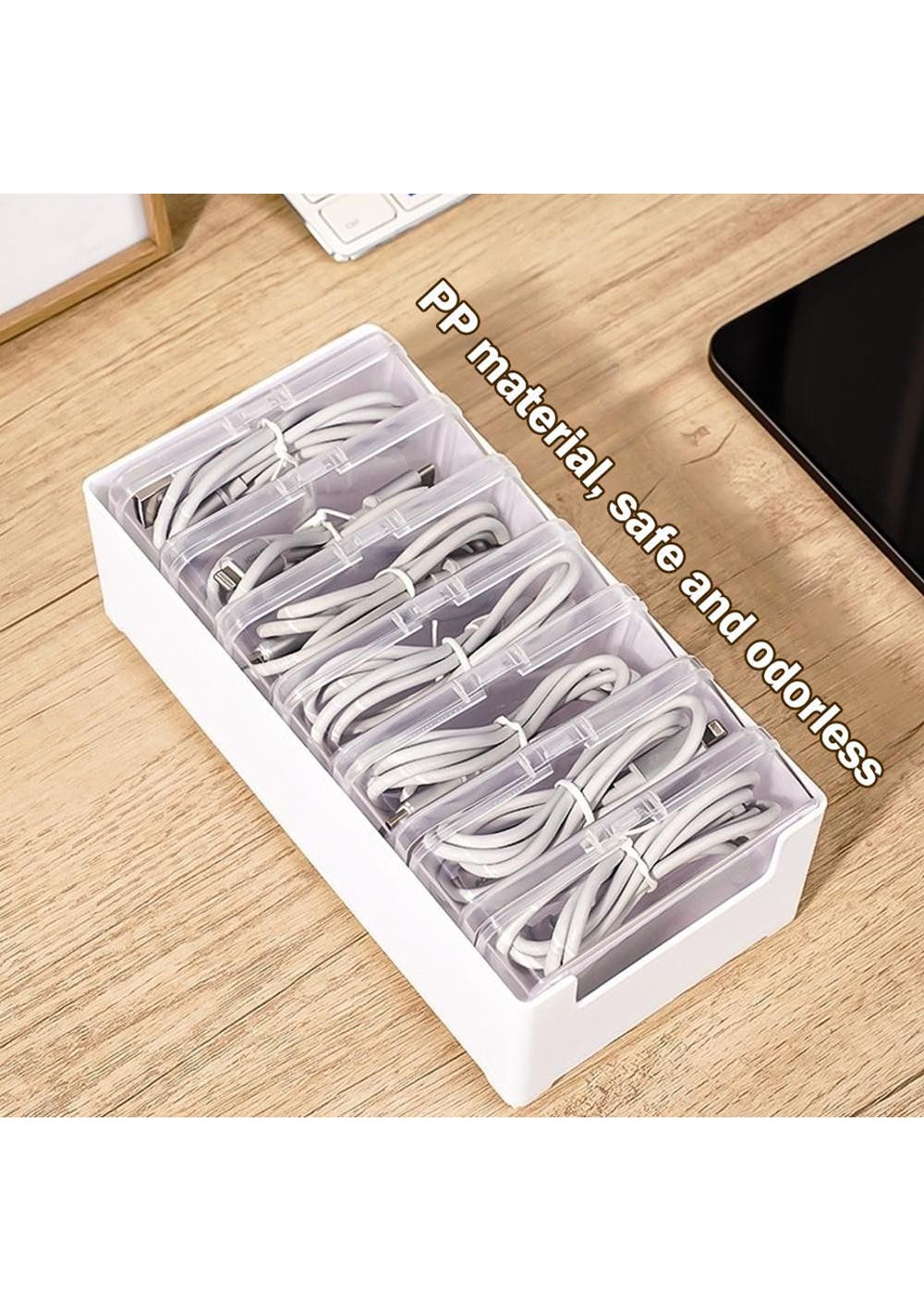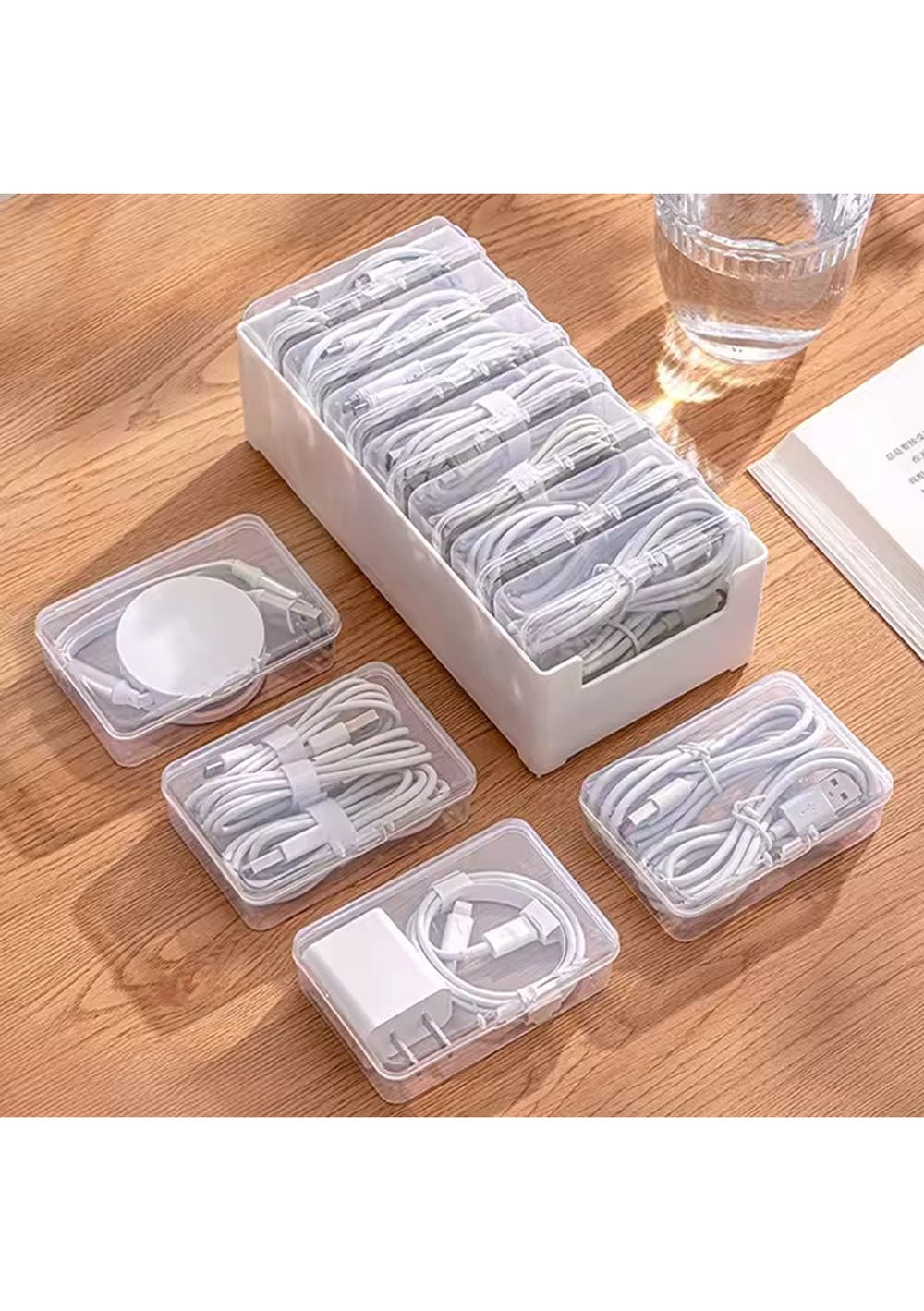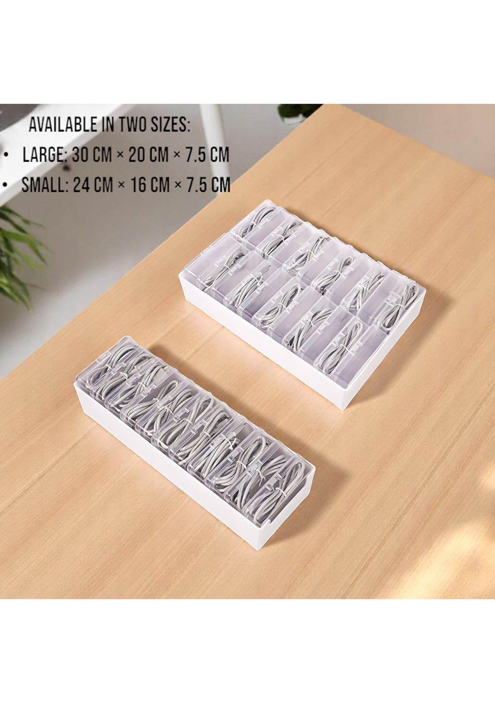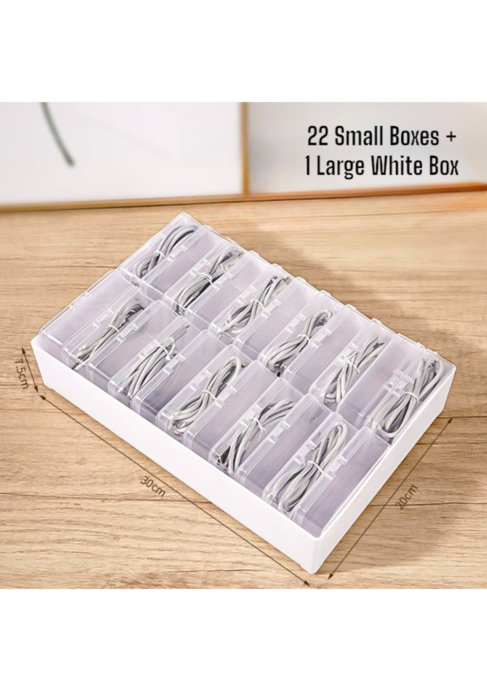 This 22-compartment cable storage organizer includes 22 small clear boxes and one large white base container. It is perfect for storing cables, chargers, and electronic accessories in a neat and accessible way at home or office.