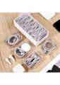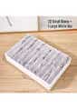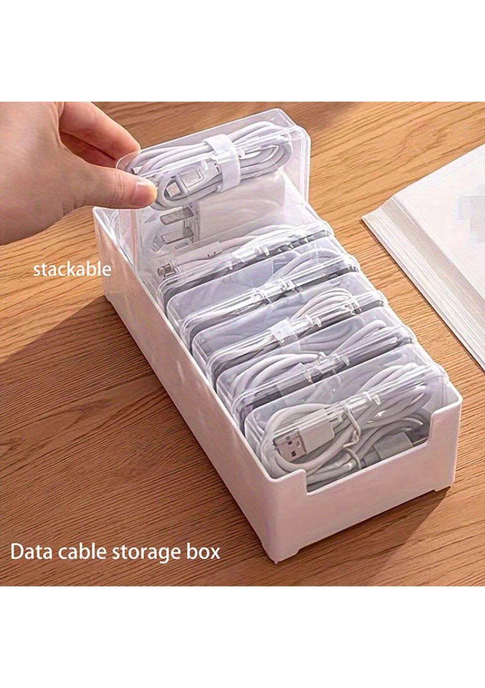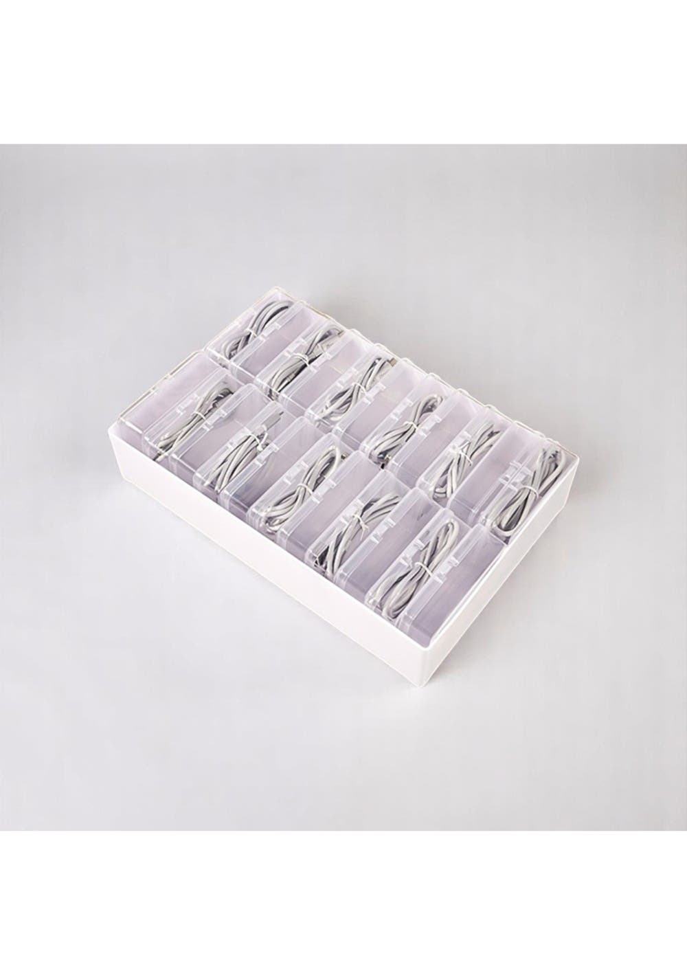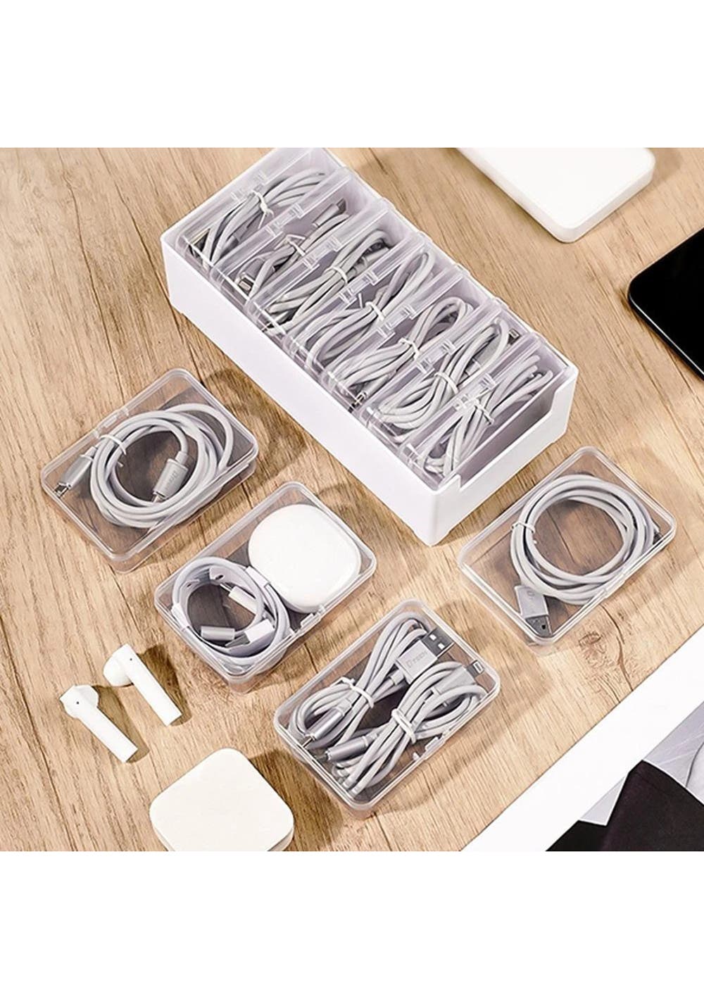 This 22-compartment cable storage organizer includes 22 small clear boxes and one large white base container. It is perfect for storing cables, chargers, and electronic accessories in a neat and accessible way at home or office.