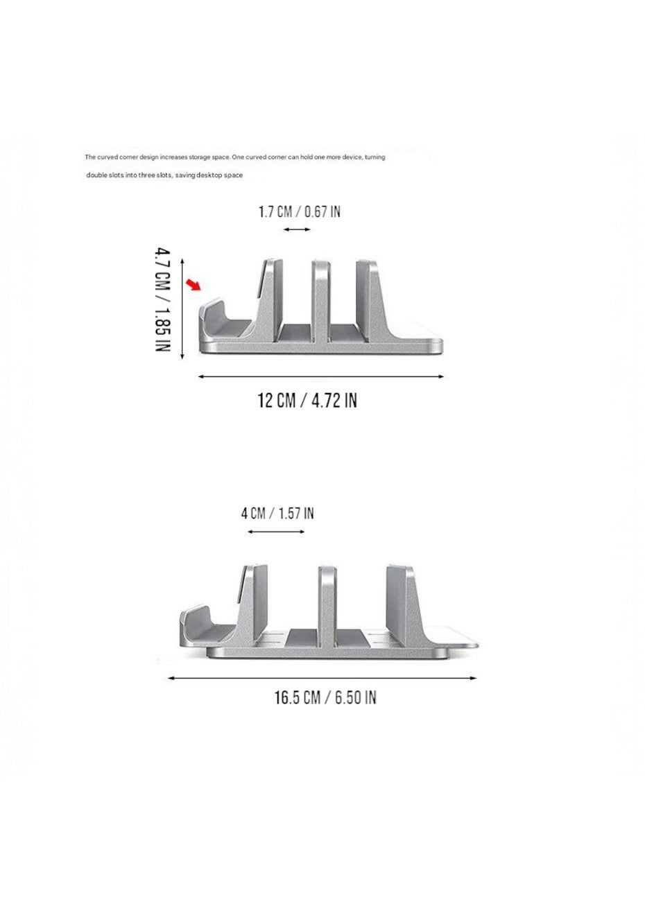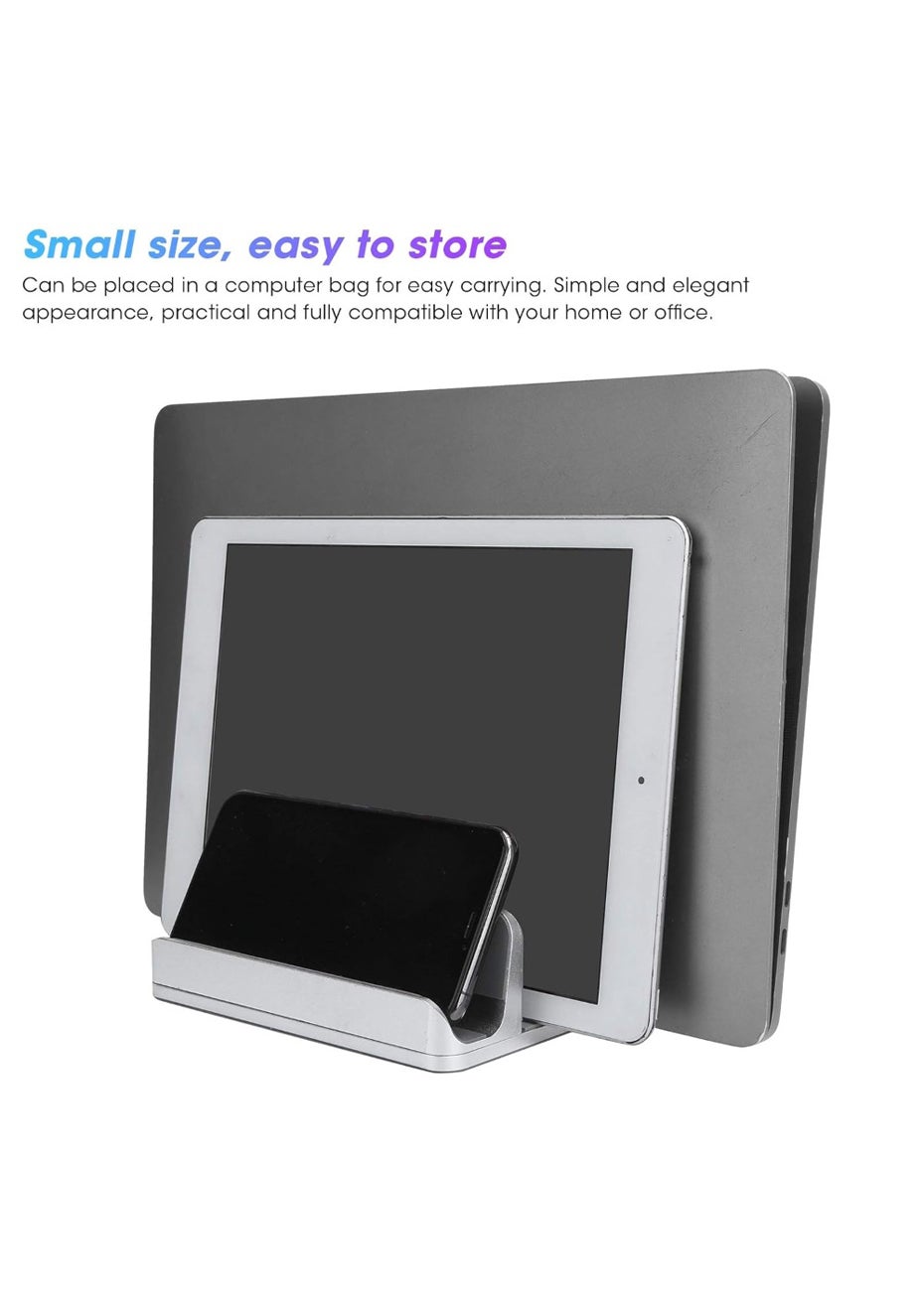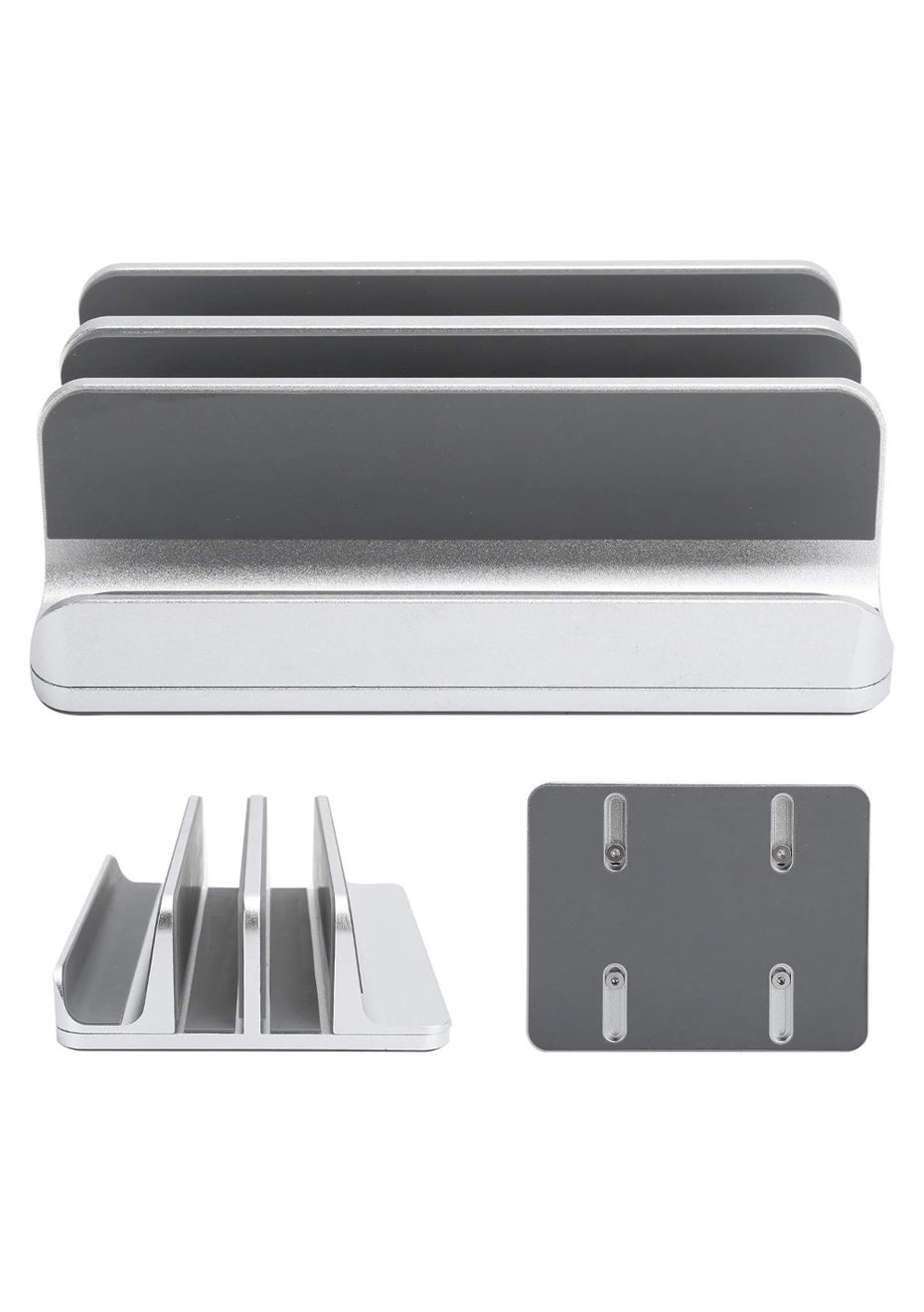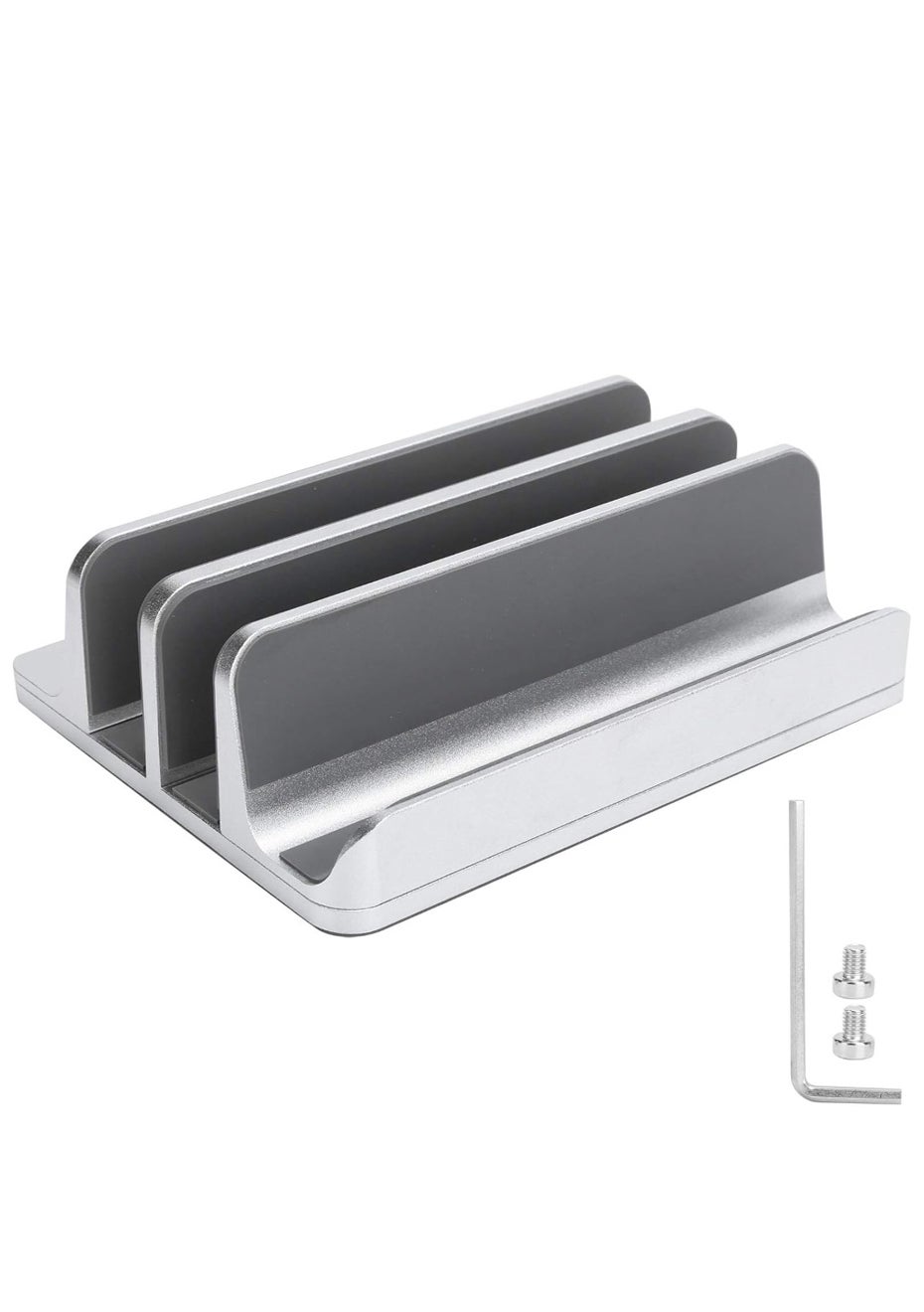 Adjustable Vertical Laptop Stand – Dual Slot Aluminum Holder Material: Body: Aluminum Alloy Product Dimensions: 15 × 12 × 4.7 cm Adjustable Slot Width: 1.4 – 4.2 cm (use included hex key to adjust by loosening the bottom screw) Package Dimensions: 17 × 12.8 × 5 cm Weight: 757g Key Features: • Dual-Slot Design: Store and organize two devices simultaneously—perfect for laptops, tablets, or phones. • Adjustable Width: Easily customize each slot from 1.4 to 4.2 cm to fit various device thicknesses. • Premium Build: Made of CNC-machined aluminum alloy for a sturdy, minimalist look that matches MacBooks and other modern devices. • Scratch-Free & Slip-Resistant: Inner silicone padding protects devices from scratches and holds them securely in place. • Space-Saving Organizer: Ideal for decluttering your desktop or workstation—great for office, home, or studio setups. Package Includes: • 1 x Dual Vertical Laptop Stand • 1 x Hex Wrench