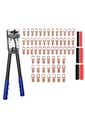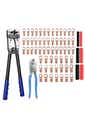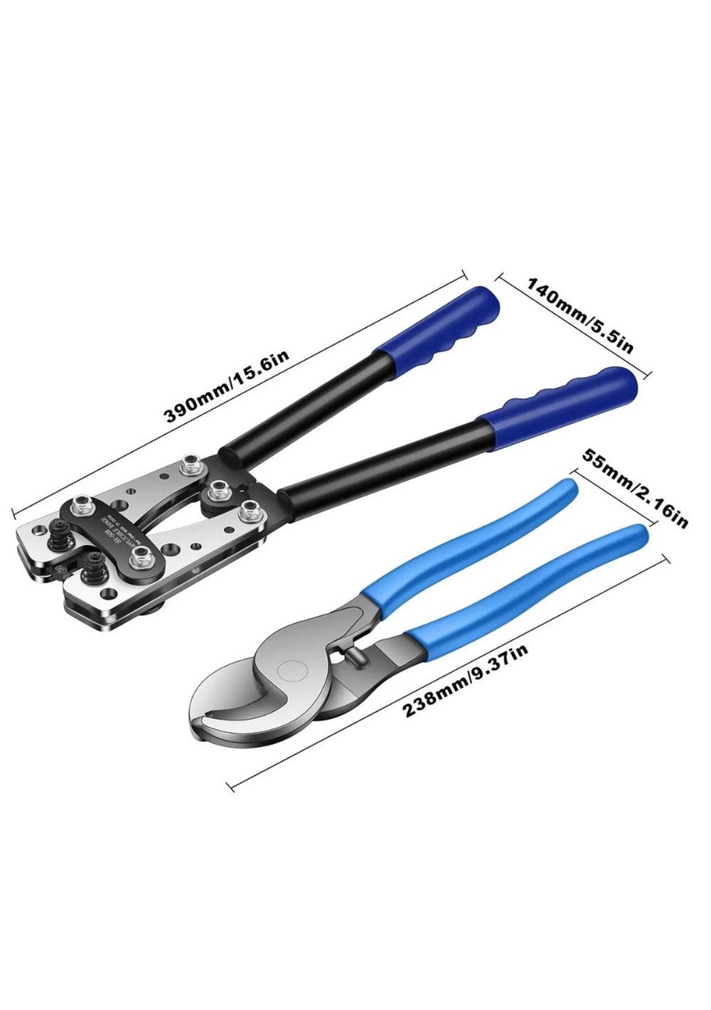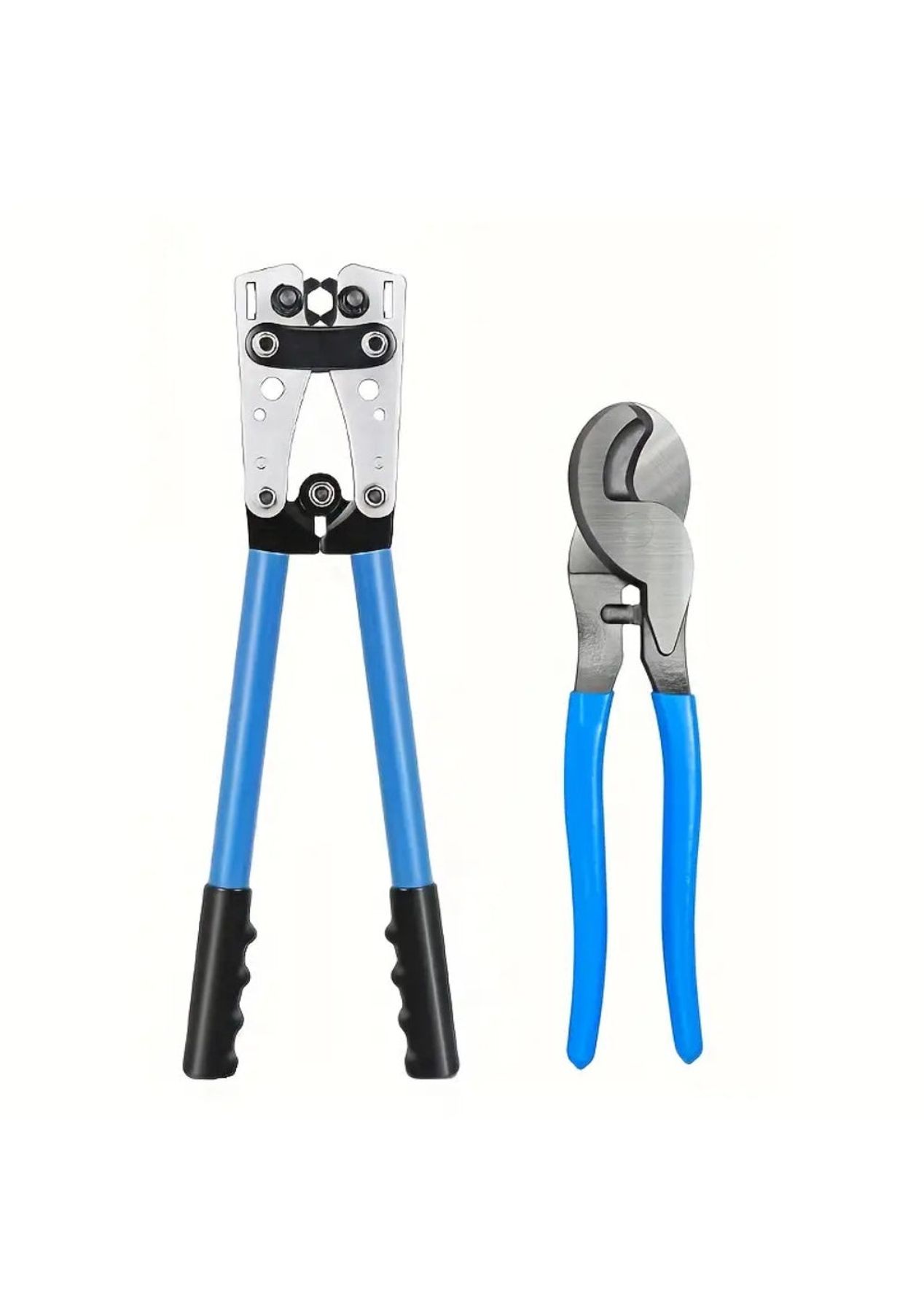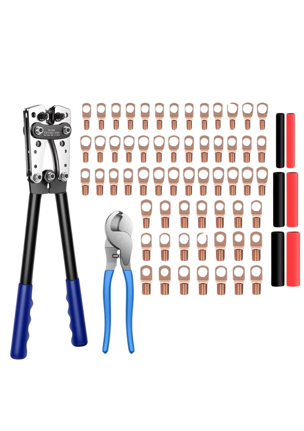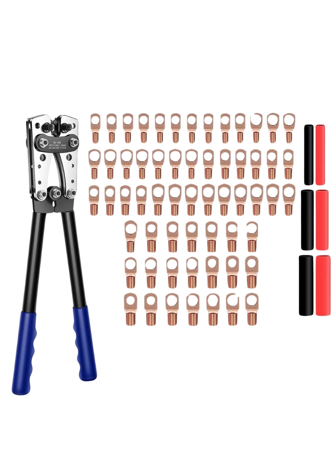 Product Description:This battery cable crimping tool kit is a comprehensive set designed for various electrical wiring tasks. It includes a crimper, a wire cutter, ring terminals, and heat shrink tubing, providing users with essential tools and accessories for efficient and professional electrical installations.The crimper is a key component, engineered to handle a wide range of wire sizes. Its adjustable jaws enable users to easily select the appropriate crimp size for their battery cables. This ensures secure and reliable connections for different wiring projects.The kit also features a wire cutter, constructed from high-quality carbon steel. This cutter is designed to deliver precise and clean cuts, which are crucial for achieving optimal electrical connections. Its high hardness contributes to its durability and long service life, making it a dependable tool for any electrical project.The inclusion of ring terminals and heat shrink tubing enhances the functionality of the kit. Ring terminals provide secure and reliable connections, ensuring efficient power transfer and minimizing the risk of loose connections. Heat shrink tubing adds an extra layer of insulation and protection to the connections, further enhancing their durability and safety. Product Specification:Material: Carbon SteelColor: BlueCrimping Plier Size: 39 x 14cmWire Cutter Size: 23.8 x 5.5cmWeight: 1.374kgFunction: Cable CrimperPackage Inclusion:1 x Crimping Plier1 x Wire Cutter (Optional)60 x Heat Shrink Tubing60 x Terminals