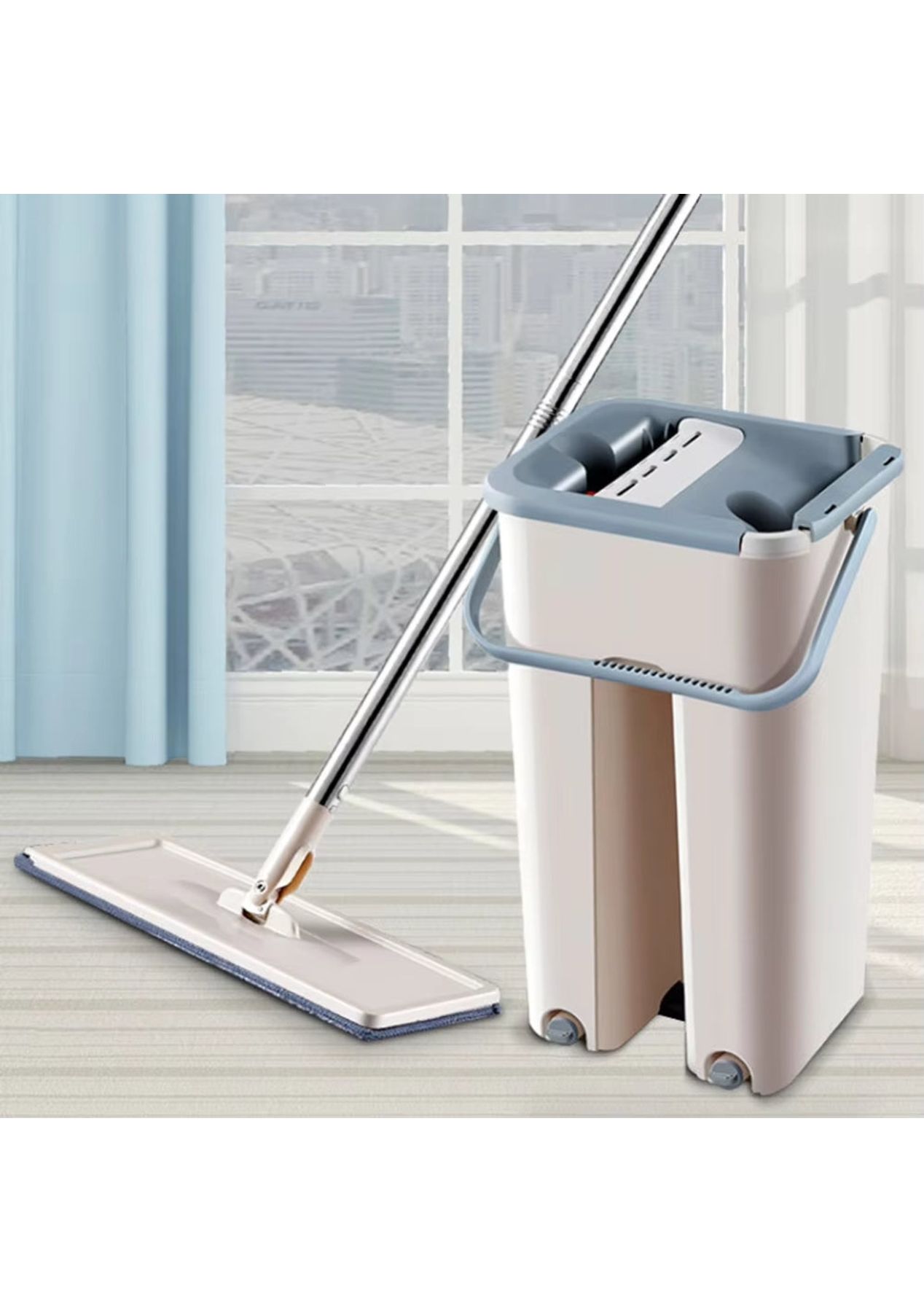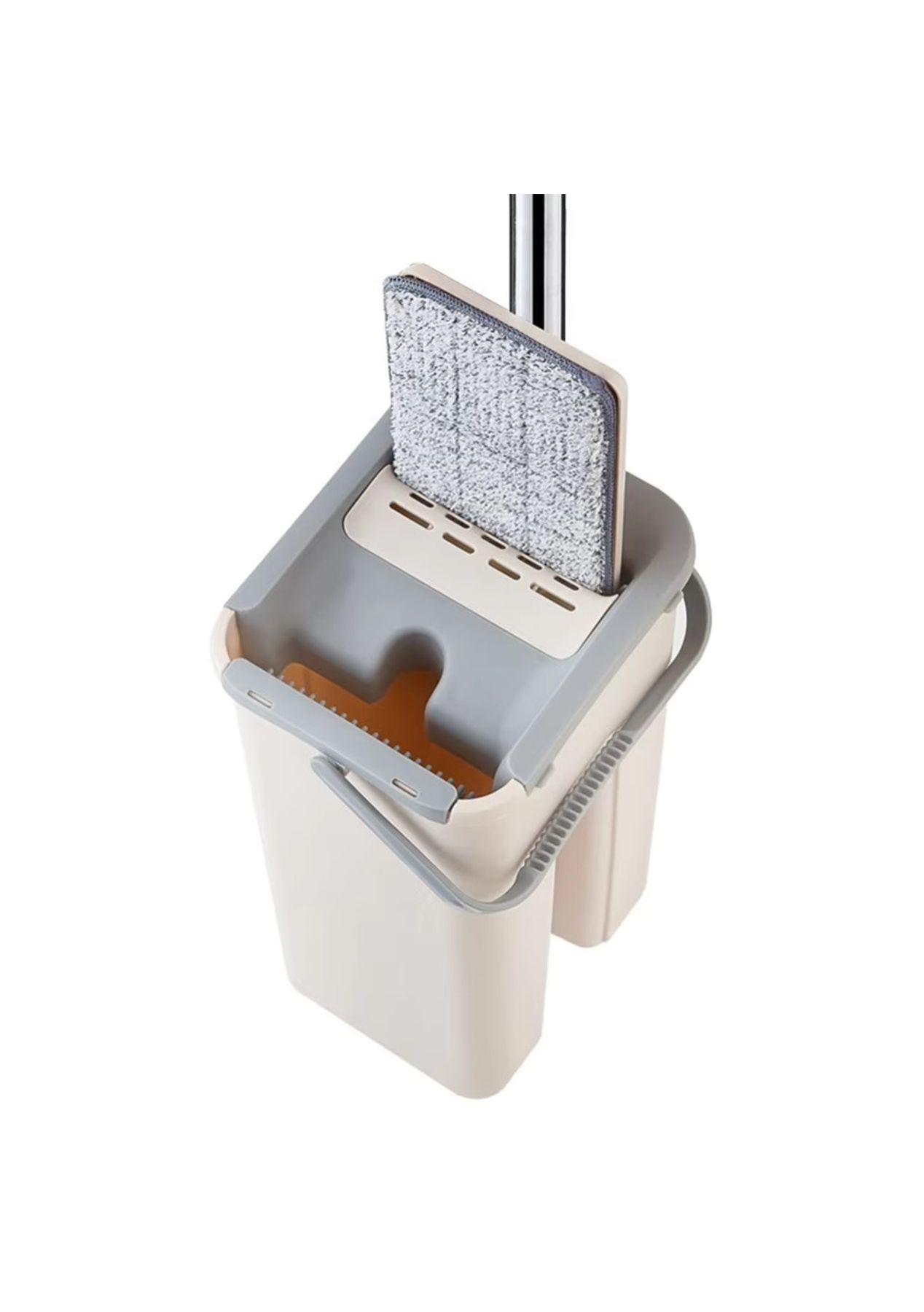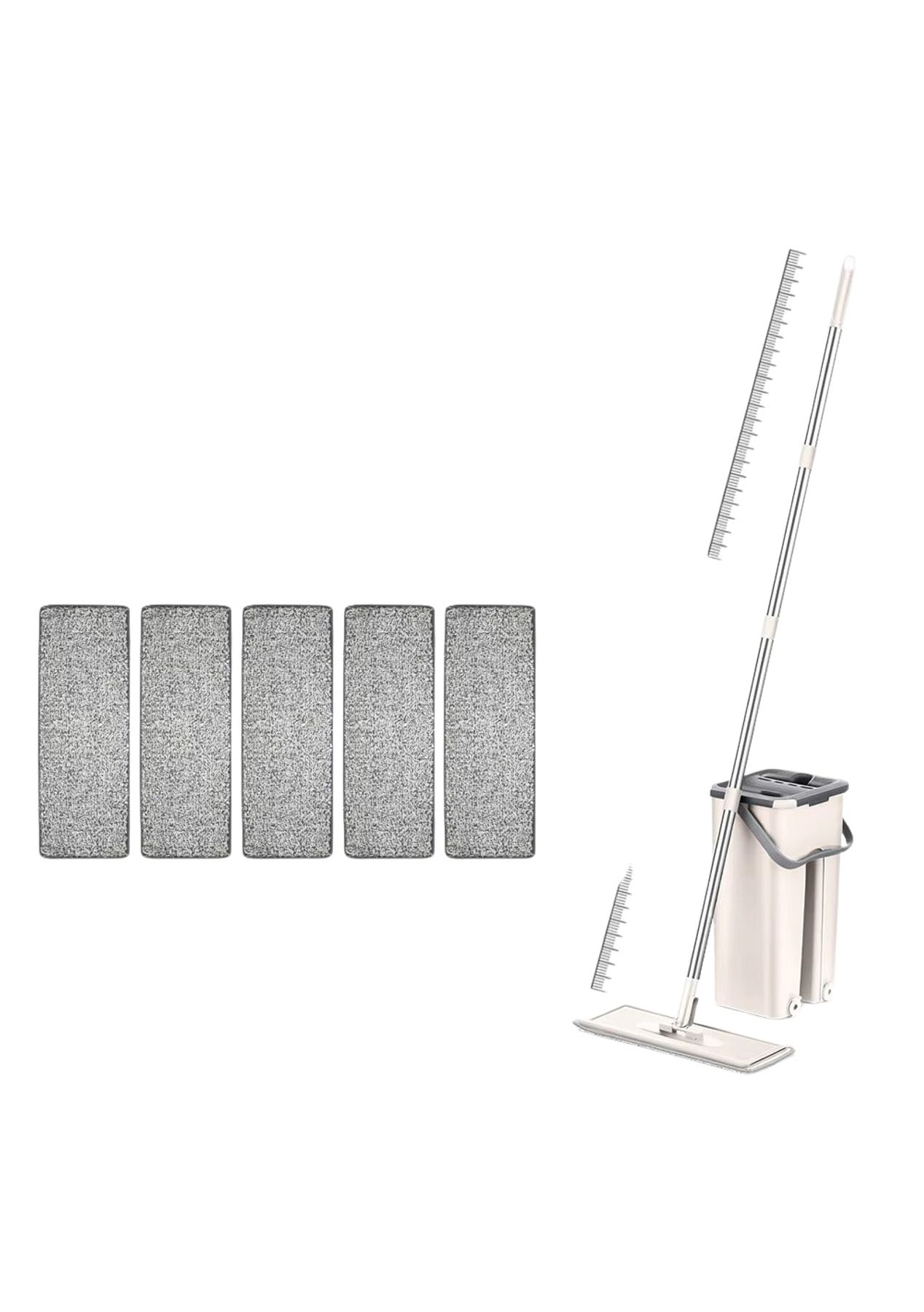 Product Description:This innovative mopping system offers a convenient and efficient solution for maintaining clean floors throughout your home. Designed for ease of use, the set includes a flat mop and a specialized bucket that facilitates hands-free wringing. This feature eliminates the need to manually squeeze out excess water, keeping your hands clean and dry during the mopping process.The mop itself features a 360-degree rotating head, allowing for effortless maneuvering around furniture and into tight corners. Its slim design enables it to reach under tables and other low-lying areas with ease. The included microfiber mop pads possess strong water absorption capabilities, effectively lifting and trapping dirt, dust, and spills from various hard floor surfaces such as wood, tile, and marble.Constructed with durability in mind, the bucket is made from high-quality PP material, ensuring long-lasting use. The mop handle is crafted from sturdy stainless steel, providing a comfortable and secure grip. The lightweight design of the entire system, weighing approximately 1300g, further contributes to its ease of handling and maneuverability during cleaning tasks.This versatile cleaning tool is suitable for a wide range of hard floor types, making it a practical addition to any household. Its efficient design helps save both time and effort in maintaining spotless floors. The combination of the hands-free wringing mechanism, the maneuverable mop head, and the absorbent microfiber pads ensures a thorough and convenient cleaning experience for kitchens, bathrooms, living rooms, and more. Product Specification:Material: Microfiber Fabric + Polyester + Stainless SteelColor: Grey, Beige, WhiteBucket Size: 19 x 16 x 34cmPad Size: 12 x 32cmHandle Size: 121cmWeight: 1.21kgFunction: MopPackage Inclusion:1 x Bucket 1 x Mop 4/6 x Pads (Optional)