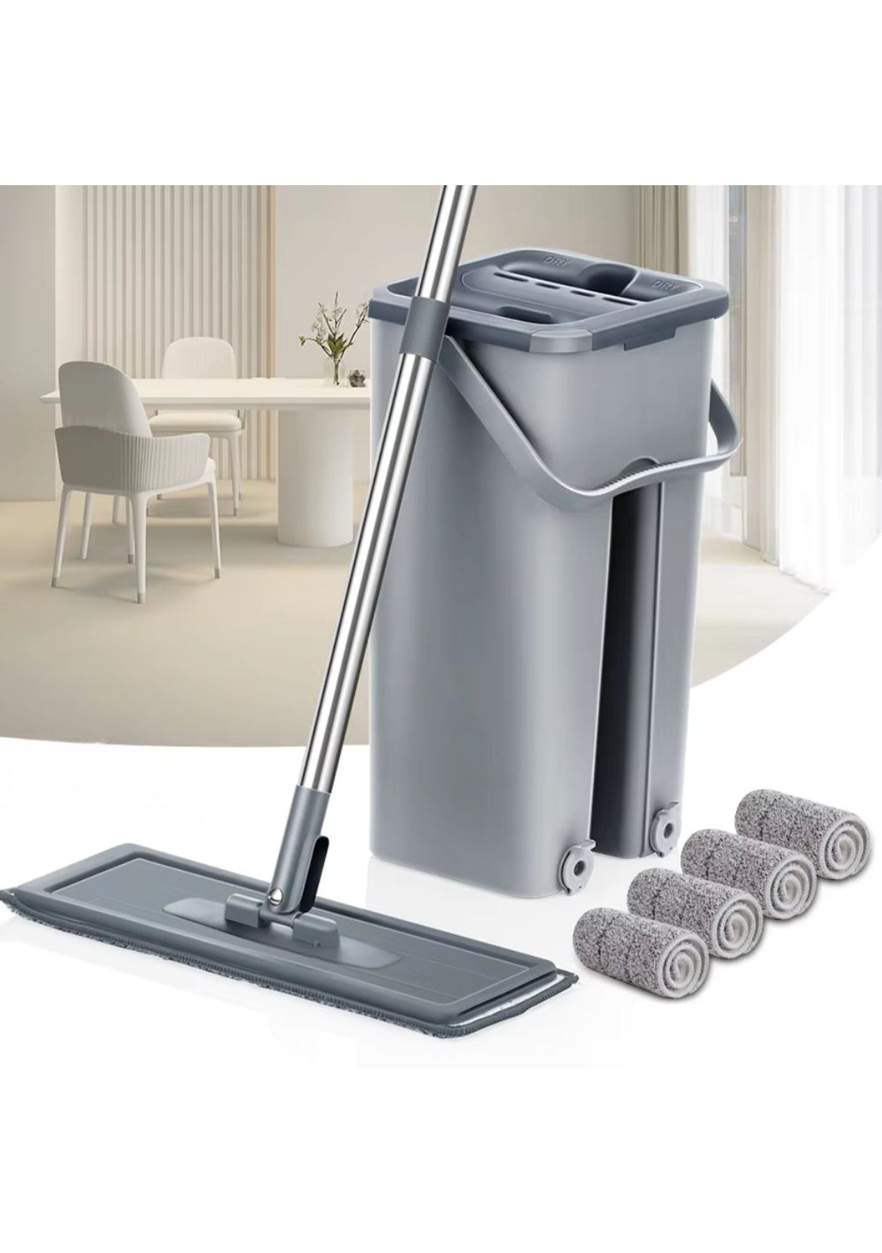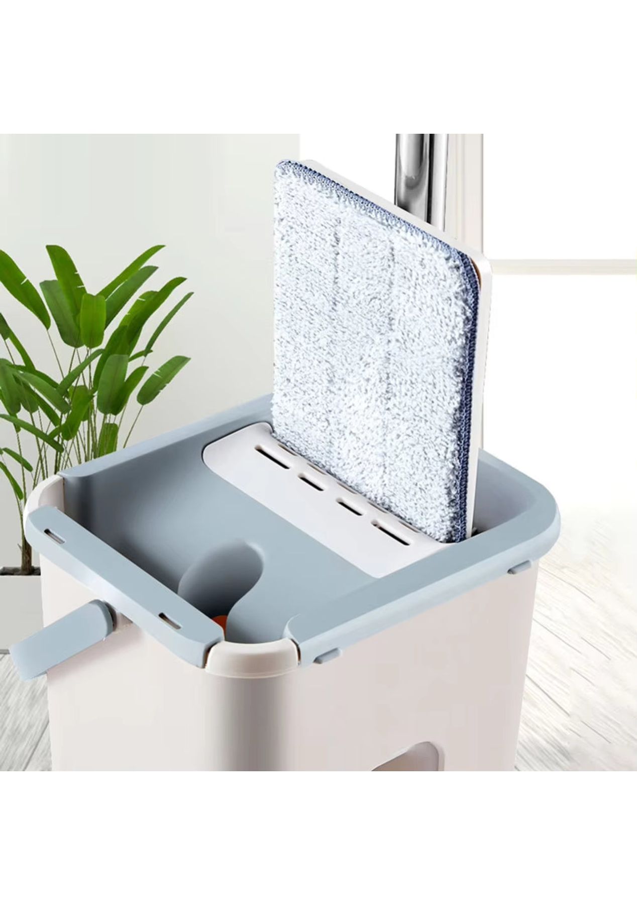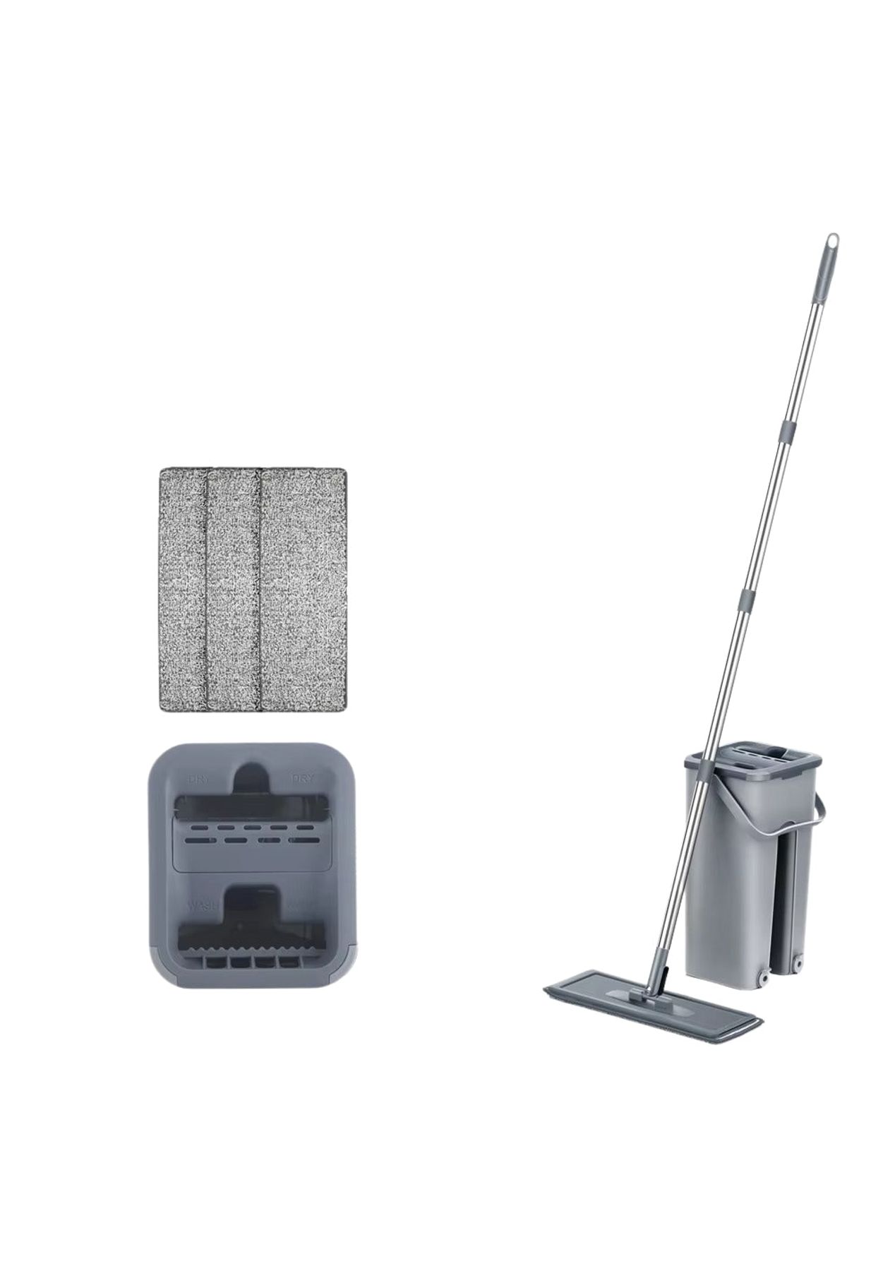 Product Description:This innovative mopping system offers a convenient and efficient solution for maintaining clean floors throughout your home. Designed for ease of use, the set includes a flat mop and a specialized bucket that facilitates hands-free wringing. This feature eliminates the need to manually squeeze out excess water, keeping your hands clean and dry during the mopping process.The mop itself features a 360-degree rotating head, allowing for effortless maneuvering around furniture and into tight corners. Its slim design enables it to reach under tables and other low-lying areas with ease. The included microfiber mop pads possess strong water absorption capabilities, effectively lifting and trapping dirt, dust, and spills from various hard floor surfaces such as wood, tile, and marble.Constructed with durability in mind, the bucket is made from high-quality PP material, ensuring long-lasting use. The mop handle is crafted from sturdy stainless steel, providing a comfortable and secure grip. The lightweight design of the entire system, weighing approximately 1300g, further contributes to its ease of handling and maneuverability during cleaning tasks.This versatile cleaning tool is suitable for a wide range of hard floor types, making it a practical addition to any household. Its efficient design helps save both time and effort in maintaining spotless floors. The combination of the hands-free wringing mechanism, the maneuverable mop head, and the absorbent microfiber pads ensures a thorough and convenient cleaning experience for kitchens, bathrooms, living rooms, and more. Product Specification:Material: Microfiber Fabric + Polyester + Stainless SteelColor: Grey, Beige, WhiteBucket Size: 19 x 16 x 34cmPad Size: 12 x 32cmHandle Size: 121cmWeight: 1.21kgFunction: MopPackage Inclusion:1 x Bucket 1 x Mop 4/6 x Pads (Optional)