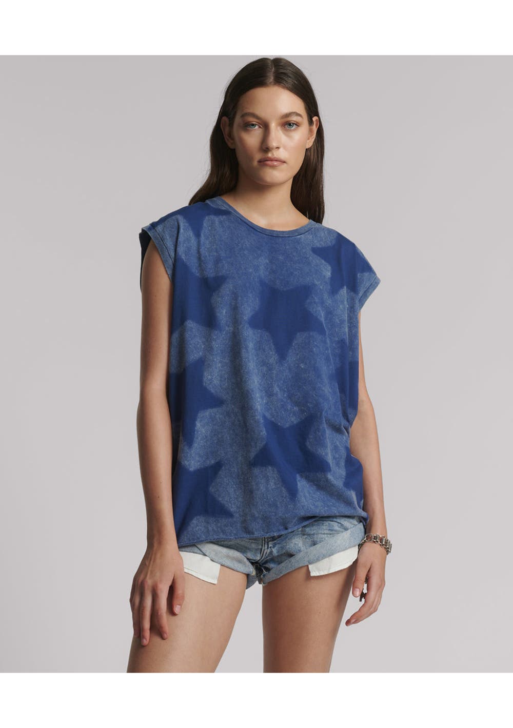 Shine bright in the BLUE STAR DUST OVERSIZED TANK. Stylish, feminine and utilitarian Classic, slightly oversized sleeveless tank top. Crafted from super soft washed-back cotton fabrics. Hand-dyed with intricate star-patch removal effect. Acid wash.