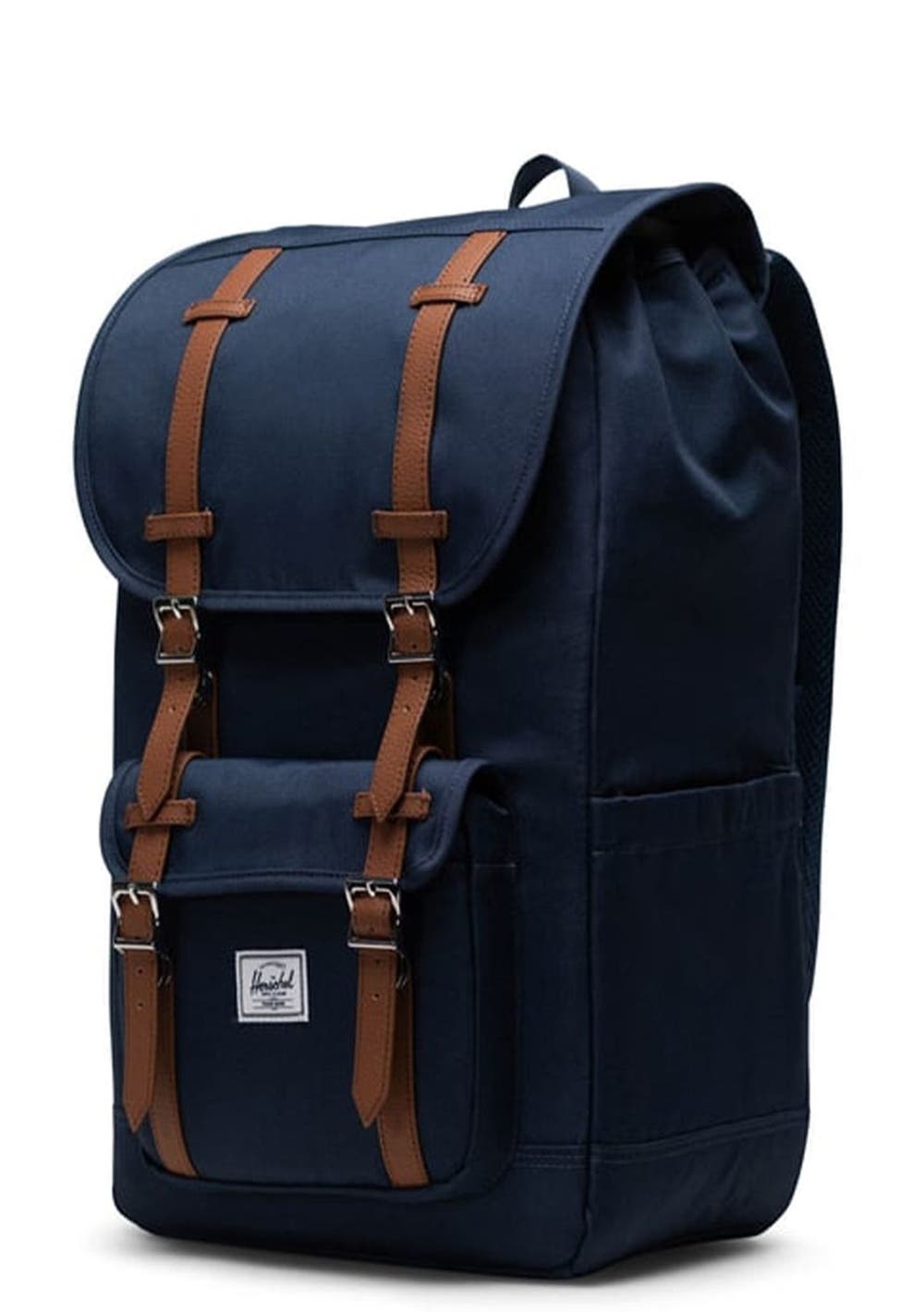 The Herschel Little America Backpack 30L is an exemplary blend of style, sustainability, and functionality.Constructed from EcoSystem‚Ñ¢ 600D Fabric, this backpack is eco-friendly, utilising 100% recycled post-consumer water bottles, making it an excellent choice for environmentally conscious consumers. This stylish backpack features a padded and fleece-lined floating sleeve, ideal for securing a 15"/16" laptop. The easy U-pull drawcord closure combined with magnet-fastened straps with metal pin buckles is as secure as it is trendy. The adjustable, padded shoulder straps and sternum strap ensures a comfortable wear, even when carrying heavy loads. The dual water bottle pockets, side entry zipper, top lid pocket with key clip, and a zippered front pocket provide ample storage space and organisation. The "Put Yourself Out There‚Ñ¢" label adds a nice touch as you step into the wide world, where adventures await.For a sustainable, spacious, and stylish solution to your carrying needs, the Herschel Little America Backpack 30L is the ideal choice. Shop more from Herschel NZ wide with us today.