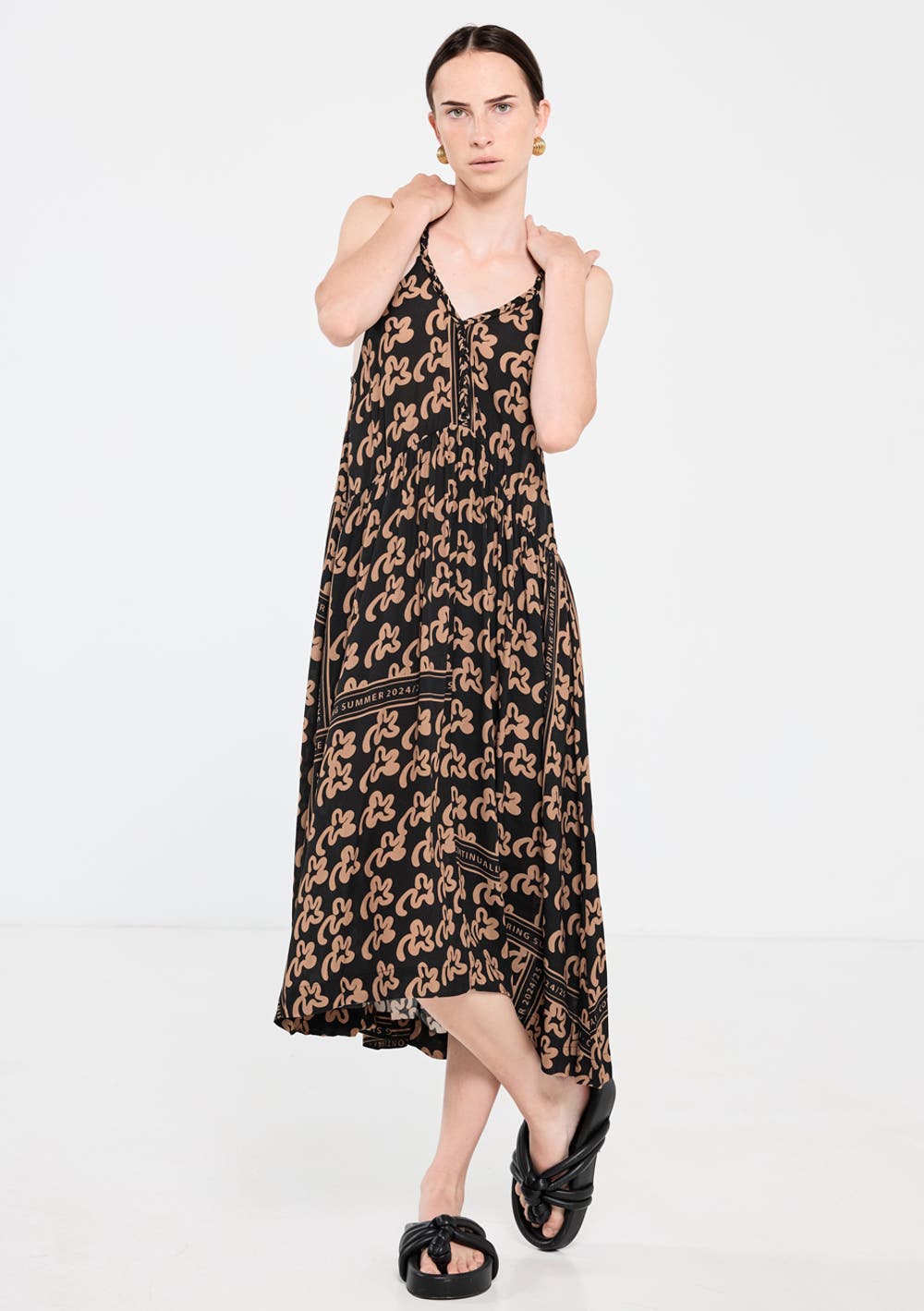 Indulge in the ultimate expression of summer time elegance with the Plantation Tea Gown in the stunning Beige Pop Palm Print, part of our new SS2024/25 collection. Perfect for those special occasions when only the best will suffice, this mid-length dress features a charming plaited V-neckline and delicate braided straps that exude artisanal craftsmanship. The loose draped waist highlights your natural figure while the adjustable tie-up back promises a personalized fit, ensuring you not only look amazing but also feel comfortable and fashionable. With a graceful flowing skirt, this gown offers effortless movement, making it a must-have for afternoon tea parties, garden gatherings, or any sophisticated event. Add the Plantation Tea Gown to your wardrobe for a blend of comfort and style that is unmatched. Wear it layered over a singlet or t shirt for a more casual look, we would love to see how your style this dress. We are committed to working with our makers to source low-carbon materials, which significantly reduces the carbon footprint of our pieces. Note: The garment's print is differently placed, each piece cut individually. the model is wearing an original print and not two are the same. Fabric Composition: Viscose