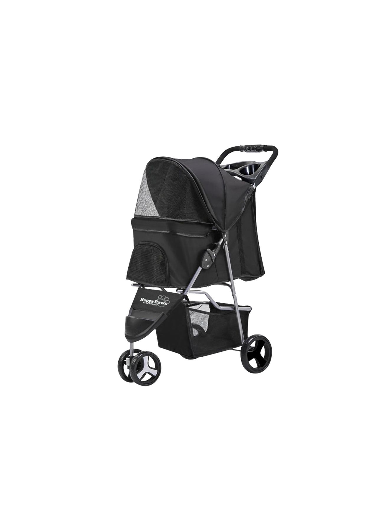 PR11701-Pet Stroller B13 BlackNeed to take your small pet out for a walk with minimum hassle? You can, with our HappyPaws Pet Stroller. It is sturdy, well-made, comfortable, and comes with a host of pet-friendly features. Such as multiple mesh screens with zippers for easy access and breathability, a bottler holder for refreshment, spacious storage, durable fabric, and omnidirectional front wheels and brake-fitted rear wheels for easy handling. Better still, the stroller can opened and kept with a simple one-step fold operation and easily washable. In short, the HappyPaws Pet Stroller is one adorable ride for your precious pet.FeaturesOne-step foldAdjustable front veilLarge space basketAnti-slip foam handle360° rotatable front wheelsWheels with dampingWear-resistant EVA wheels600D Oxford Fabric and nylon baseRear brakesBottle holderRemovable cushionAssembly requiredSpecificationsFrame material: SteelsFabric material: 600D OxfordWheels material: EVAProduct overall size: 67.7Lx47Wx101.5HcmPet cage size: 58x35x54cm (Approx)Storage basket size: 30x30x20cm (Approx)Pet cage weight capacity: 15kgStorage basket load capacity: 3kgColor: Black