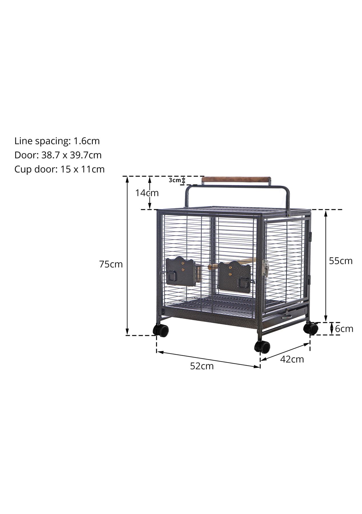 PR65729 - Portable Parrot CageThis portable parrot cage is ideal for short-term use, emergency situations and traveling. It’s lightweight design makes it easy to transport while keeping your parrot safe and comfortable. The parrot cage features a slide-out tray for easy cleaning, each feed door with a stainless steel bowl for convenient feeding and two wooden perch inside for comfortable relaxing. Constructed of heavy-duty wrought iron, this parrot cage is tough enough to ensure dependable use for years to come. Better more, the cage is supported by smooth castor wheels, making moving hassle-free. Best of all, this portable parrot carrier is a fantastic choice.FeaturesMade of powder coated steelSturdy and safeDouble handle designSmall food lift-up feeding gateCastor wheelsSlide out tray for easy cleaningFitted with 2 perches2 stainless steel bowlsColor: BlackOverall dimensions: 52 x 42 x 75cm Packaging Dimensions: 56.5x 53.5x16CM
