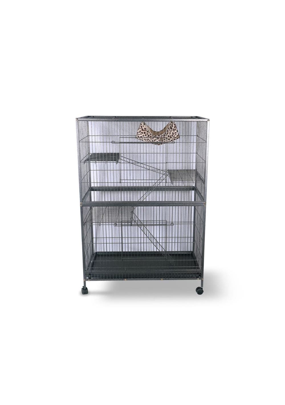 PR2193 Plenty of height and width to roam and jump about. Three removable platforms and three activity ladders. And a funky hammock to top it all. Constructed with metal frame-mesh and powder-coated for durability and anti-rust properties. The bottom tray slides out for easy cleaning and the large access doors make feeding a breeze while the locks and latches help to keep your pets secured and away from prying predators. Not least, the four castor wheels enable the entire unit to be wheeled to any location hassle-free. Give your pets a home that they’ll appreciate in their own natural instinctive way.FEATURESMulti-levelBlack powder-coated metalOne funk hammockThree removable platformsThree activity laddersCage base latchAccess doors with secured locksFour castor wheelsColor: BlackOverall Dimension:93x57x140 The distance between the bars is 2cm Packaging Dimensions: 97x 71x 14CM