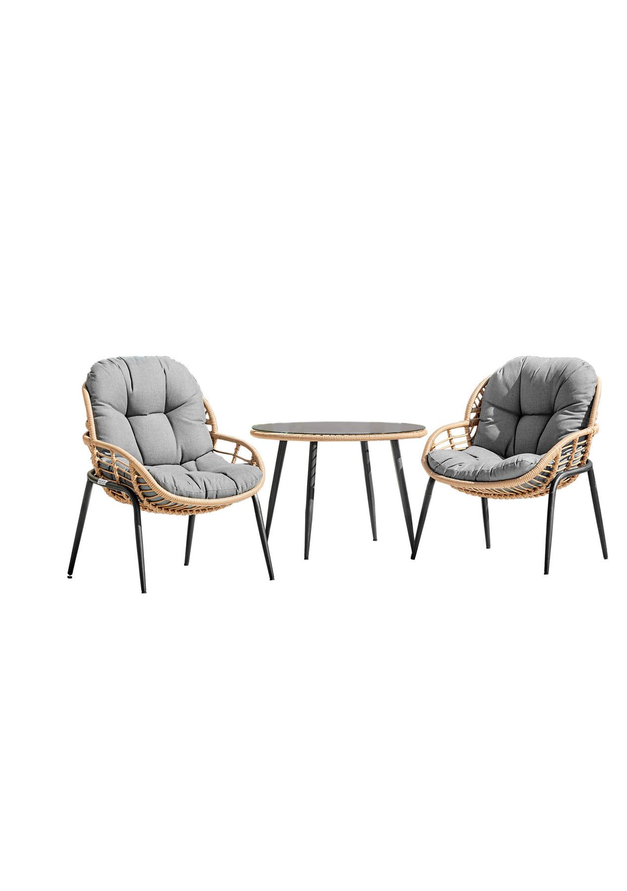 PR8818 - Naturlig Outdoor Bistro Set Complete your outdoor area with a sleek set that's sure to impress!With its chic and compact design, the Naturlig 3 Piece Outdoor Bistro Set is perfect for smaller outdoor spaces. Featuring two steel-framed chairs and a tempered glass-top table, this stylish set is made from UV-resistant wicker and fabric.Grey seat padded cushion covered with polyester fabric makes this set perfect for creating a light and breezy outdoor look, exuding laidback vibes.Make the most of your outdoor space with the beautiful Naturlig 3 Piece Outdoor Patio Set.FeatureHeavy-duty powder-coated steel frameSleek black legsQuality PE round rattanHigh-density foam seat cushionsSimple assembly requiredLounge chair x 2Coffee Table x 1SpecificationMaterial: Steel + PE rattanColour: brown rattan + cream cushionDimension: Lounge chair: 65 x 76 x 83 cmCoffee Table: 56 dia x46 cm Care and maintenance to extend the life of your outdoor furniture - Store in dry place or use protection covers when not in use - Keep cushions dry and away from sunlight to reduce fading /Fraying when not in use- Treat metal surfaces with rust inhibitor coating as required- Avoid exposing synthetic rattan to high temperatures over a long period of time Dimensions:90x54x70CM