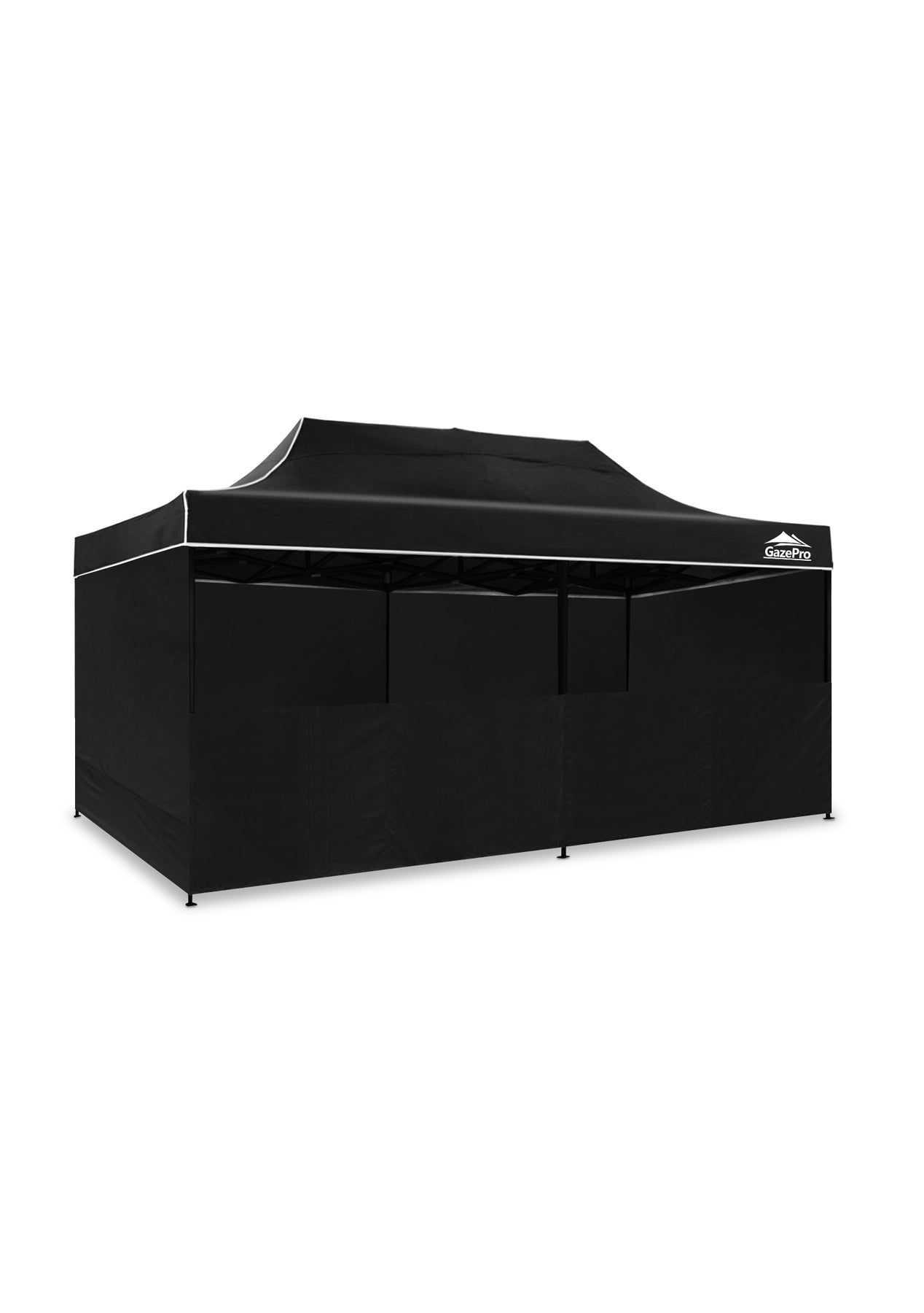 PR9260 - Gazebo C Silver coated roof 3x6m Black Enjoy the outdoors more with this pop-up outdoor gazebo. This GAZEPRO 3m x 6m pop-up gazebo provides a lovely ground & canopy coverage of 3m x 6m. This gazebo is perfect for all your upcoming outdoor activities. Featuring high-density, long last silver-coated oxford fabric with effective UV & water-repellent treatments. With thick & quick-to-erect powder-coated steel frame equipped with strong legs & struts structure.Note: Gazebos can be used free-standing when there is no wind but they need to be pegged onto the ground or would need sandbags or water bases to secure them. The gazebo is not designed as a permanent structure & it is not recommended to be used under extreme weather conditions or for a prolonged period of time.Recommended minimum 2-person set up.GAZEBO FEATURES:Long-lasting silver-coated 420D oxford fabric Rust-resistant frameHeat & water resistant roof4 adjustable height levelsEasy-glide internal joints for easy setupSafety Release cap for easy fold upFull wall kit including 3x full height side wall & 1x half wall for stall operatorsGAZEBO SPECIFICATION:Frame: Black powder-coated steel frameRoof: Silver-coated 420D oxford fabricWall: 210D oxford fabricAssembled Size: 3m x 6mColor: BlackGAZEBO SET CONTAINS:1x 3m x 6m Gazebo Frame2X Side Wall(3x2m)1X Side Wall(6x2m)1X Half Wall(6x0.75m)