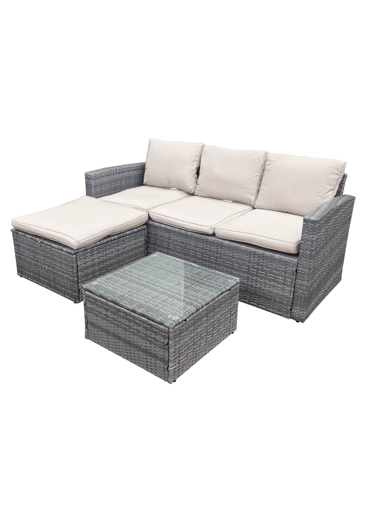 PR10091 Rio 3PC Outdoor Sofa Set Beige Ideal for smaller spaces, the Rio 3PC Wicker Set with Storage gives you elegance and style perfectly blended with practicality. Great for creating your own personal oasis outdoors, this set is comfortable and easy to maintain. It promises luxurious and spacious comfort matched with long-term durability and robust use in any weather condition. With its PE wicker handiwork and heavy-duty steel frame, the stylish outdoor set is made to last. The removable cushion cover is easy for cleaning. The ottoman opens to reveal an ample-sized storage space that can be used for anything from toys to garden tools to blankets. Not least, the entire Set can be easily configured to any arrangement that appeals to you.FeatureModular designHeavy-duty steel frameOttoman with storageHigh-density foam seat cushionsRemovable cushion coversSimple assembly requiredSpecification1 x 3-seater sofa1 x Ottoman1 x Coffee Table With Tempered GlassRattan Material: PE Rattan color: greyCushion color: beigeDimensions: Sofa: 180 x 72 x 75.5cmOttoman: 65 x 64 x 35.5cmCoffee Table: 58 x 58 x 32 cm Dimensions170x81x43CM