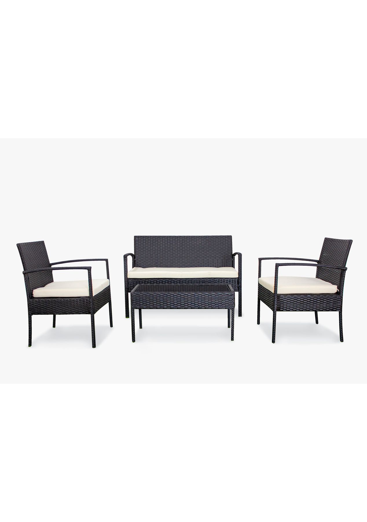 PR666445 - Classique Outdoor Lounge 4Pc This outdoor garden furniture set is characterized by excellent durability and optimal design. Two comfortable armchairs and a sofa are perfect for relaxing and socializing. Pillows with approx. 6cm and resistant to weather conditions. Elegant table completed with a plate of black tempered glass. Enjoy the sun on your terrace with this elegant rattan furniture set!FeaturesSet includes 2 armchairs, 1 sofa, and 1 tableCushion color: WhiteMaterial: WickerFrame: Powder Coated SteelThe Garden furniture set is characterized by excellent durability and optimal designTwo comfortable armchairs and a sofa are perfect for relaxing and socializingPillows with approx. 6cm filling with foam is includedThe unique set is made of a durable powder-coated steel frame and brown, UV-resistant polyrattanPillows are water-repellent.Product DetailsPieces Included: 2 Arm Chairs, 1 Sofa, 1 Table, and 3 Seat CushionsDurability: Weather ResistantSpecs:2 Seater:W108xD60xH711 Seater: W59xD60xH71Table : W75xD41xH38Rattan Color: BlackCushion Color: Ivory Care and maintenance to extend the life of your outdoor furniture- Store in dry place or use protection covers when not in use - Keep cushions dry and away from sunlight to reduce fading /Fraying when not in use- Treat metal surfaces with rust inhibitor coating as required- Avoid exposing synthetic rattan to high temperatures over a long period of time Dimensions:116x36x57 CM