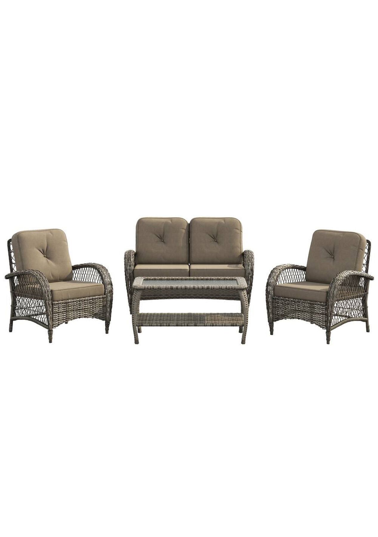 PR65880 Outdoor Sofa Set A183Bring comfort and style to your outdoor space with this wicker sofa set. The powder-coated metal frame combines with premium PE wicker to create a traditional and coastal style that's perfect for entertaining guests. The removable and washable polyester cushion covers in brown are amply padded for comfort, while the button-tufted seat backs add a touch of elegance. The water-resistant set includes a loveseat, two club chairs, and a coffee table with a glass top for drinks and snacks.FeaturesTraditional coastal stylePowder-coated metal framePE rattanRemovable polyester cushion coversButton-tufted seat backsCoffee table with glass table topAssemble requiredSpecificationLoveseat x1Single chair x2Table x1Dimensions:Loveseat: 130x87x87.5cmSingle chair: 75x87.5x87.5cmTable: 101x55x51cmColour: grey