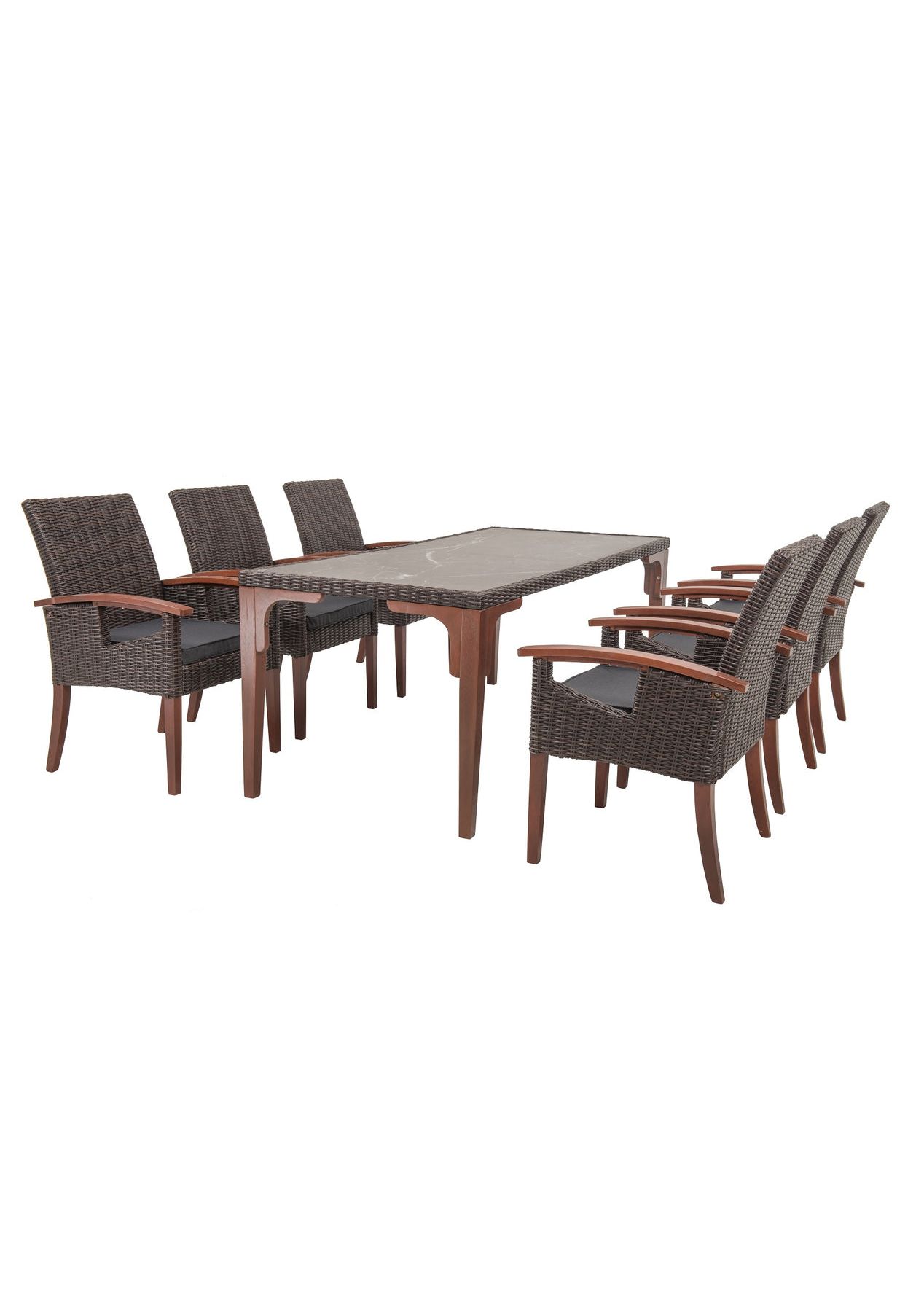 PR9334 - Cannes Outdoor Dining SetThe Cannes Wicker Dining Set are a classic and sophisticated design that compliment many outdoor decors. Featuring Merbau timber legs and a plush cushioned seat, Cannes will give any indoor dining chair a run for its money. Team this outdoor chairs with our porcelain top dining table to create a cosy outdoor dining area. Summer dinner parties are sorted with the Cannes dining set - your friends won't want to leave.Quality Features:Powder-coated aluminum frame for extra strength and durability.The wicker has been UV treated and is colourfast to the core. Solid merbau timber legs and armrestErgonomic backrestPorcelain Slab Table Top, easy to maintainDimensions:Chair: W:61cm x D:72cm x H:94cmTable: L:198cm x W:85cm x H:75cmPackage Contents1X Cannes Outdoor Dining Table6X Cannes Outdoor Dining Chair(Please message us for other combination)Care and maintenance to extend the life of your outdoor furniture- Store in dry place or use protection covers when not in use - Keep cushions dry and away from sunlight to reduce fading /Fraying when not in use- Avoid exposing synthetic rattan to high temperatures over a long period of time Chair Weight Capacity: 120KG