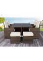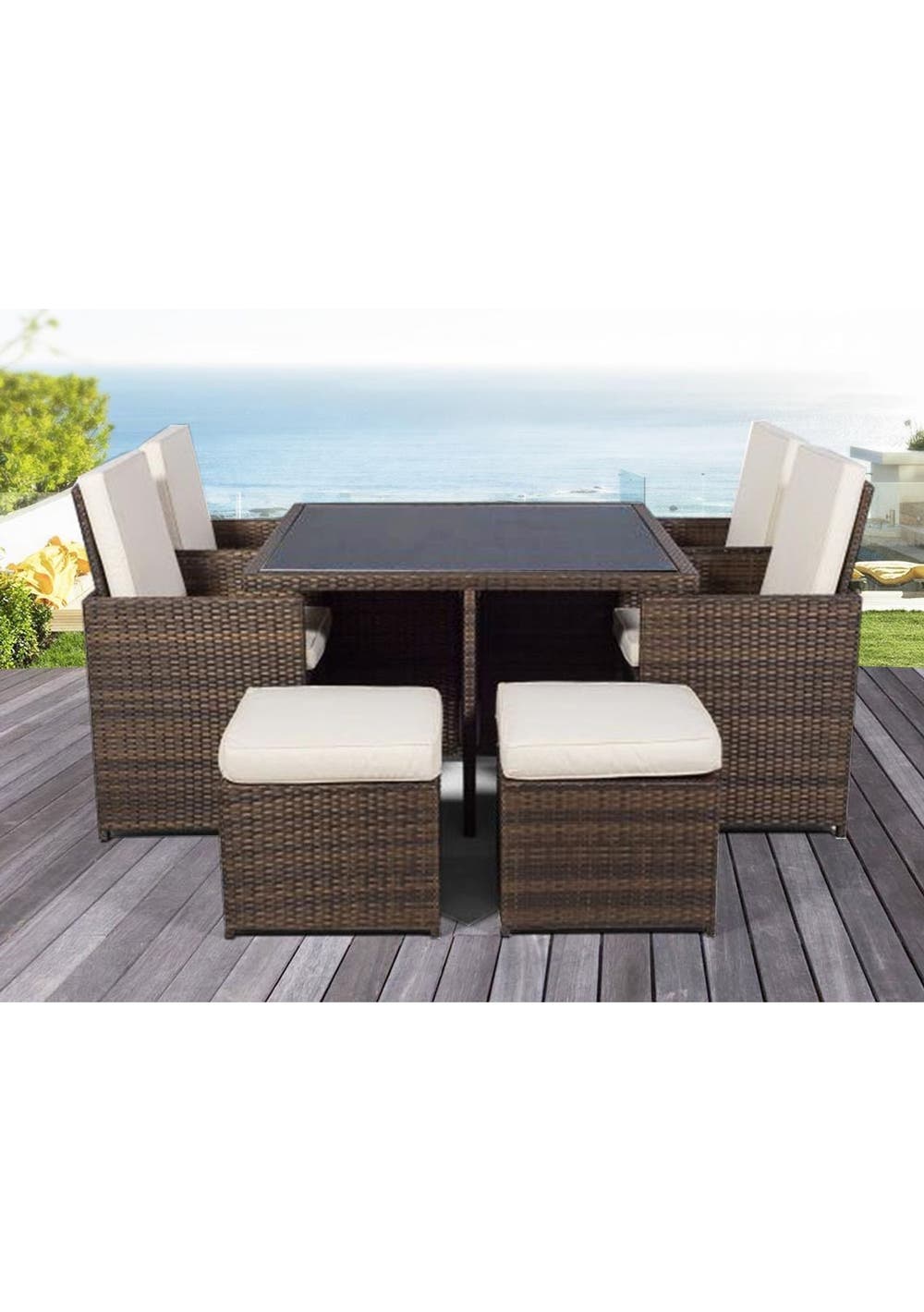 PR8745-9PC OUTDOOR CUBE DINING SETTime to give your backyard décor a complete make-over with our stylish OUTDOOR CUBE DINING SET. Made of steel frame and PE wicker, our outdoor furniture set features some amazing designs with top quality workmanship. Available as a 9-piece dining set, all the sets comes with a tempered glass top table along with seat cushions padded in high density foam that are removable and washable. With the waterproof covers, you do not need to worry about storing them during rainy days anymore. Plus, it is easy to set up with configurations that suit your space and style. Get your hands on one of our wonderful outdoor dining set soon.FeaturesTable x1Chair x4Ottoman x4Perfect for indoor and outdoorWaterproof polyester fabricRemovable zipped cushion coverHeavy-duty steel frame5mm thick tempered glass topSpace-saving designBuilt-in handlesSimple assemblySpecificationsTable and chair material: PE wickerFrame: steelTable top: tempered glassRattan colour: brownCushion colour: beigeTable dimensions: 109 x 109 x 70cmChair dimensions: 53.5 x 50 x 62cmOttoman dimensions: 42 x 42 x 35cm Care and maintenance to extend the life of your outdoor furniture - Store in a dry place or use protection covers when not in use - Keep cushions dry and away from sunlight to reduce fading /Fraying when not in use- Treat metal surfaces with rust inhibitor coating as required- Avoid exposing synthetic rattan to high temperatures over a long period of time It comes in 3 boxes.DimensionsBox A: 111x4x111CMB: 111x28x67CMC: 91x49x57CM