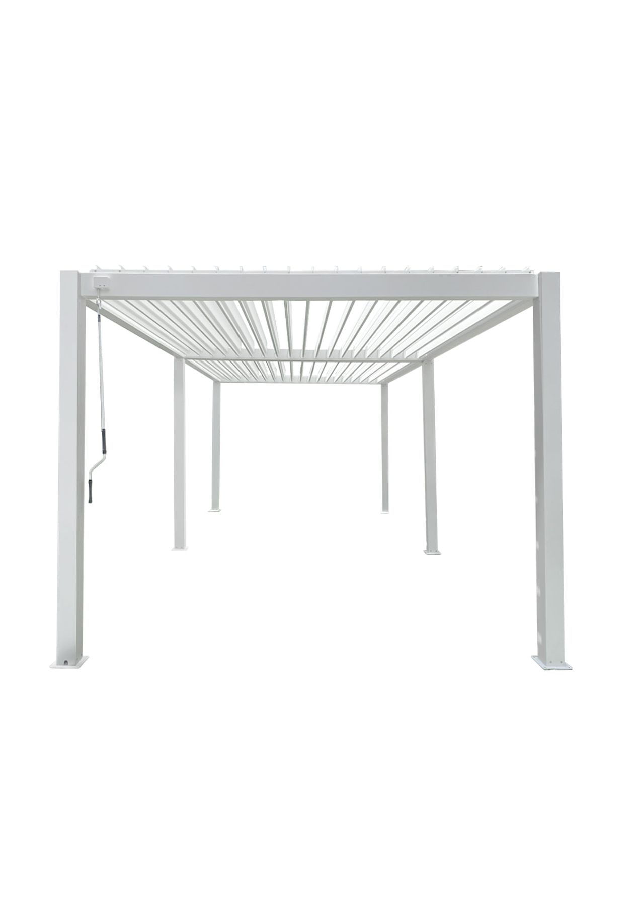 This aluminum louver pergola is a great functional addition to the most of outdoor space. Thanks to the Pergola provides a multi-season entertaining oasis. The opening roof allows the residents to choose between more or less sun exposures. Another reason pergola is a great asset that it furthers the amount of time you can enjoy your outdoor living space as the weather changes, no matter rain or shine, cold or warm, day or night. The design of the free-standing pergola appreciates its architectural style and smart integrated technology. Its drainage system provides excellent rain protection, as rainwater is funnelled away down inbuilt downpipes in the leg posts. Featuring double layer louvers are made tougher and better heat insulation. Low maintenance is another great benefit of building pergola aluminum. With its clean and sophisticated appearance, this pergola goes with any modern architecture and designs easily. It worth to invest this great asset in your backyard. Surely it will last for years. IMPORTANT NOTES:1. We strongly recommend getting professional advice before installation. 2. This free-stand pergola should be installed on a solid foundation and anchored to the ground. The substrate surface needs to be flat and leveled. 3. Please do not attempt to make alterations to these pergolas. Your warranty coverage will be voided by any adjustments and misused4. Please keep the roof open in the extreme weather to avoid the risk of damageFeatures:* Reliable sun and weather protection* Double layer louvres make stronger and better insulation* Water drainage through gutters and posts* Powder coating anti-rusted Aluminum structure* Excellent value* Waterproof pergola once the louvres are closed* Optional adding ScreenSpecification* Product Size: 295(L)x581(W)x230(H) cm* Color: White* Material: Powder coated Aluminum* Louvre operated with manual hand crank* Louvre tilt range: 90 degree* Post: 110x110x1.6mm* Beam: 136x95x1.6mm* Louvre: 168x29.6x1.4m Assembling tutorialÔºö