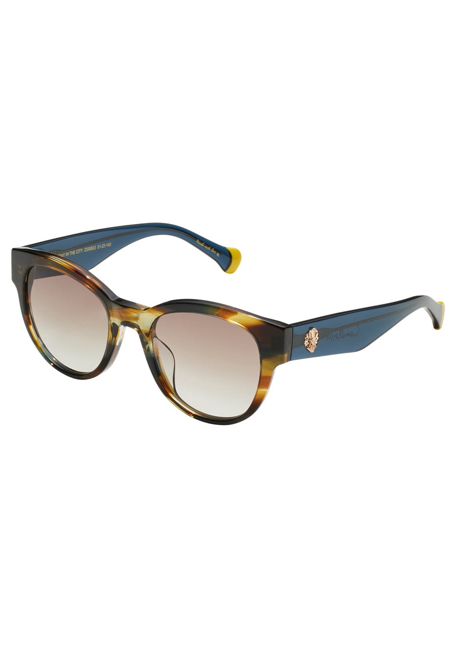 An ode to relaxed days, long lunches and no schedule. Escape every day with this vintage-inspired round sunglass designed with unique luxurious CAMILLA acetate textures. This midsize features art-deco-inspired metal hardware on both temples, highlighted with a crystal in the centrepiece, and an iconic CAMILLA tip shape with colour pop lamination. • Finished in an olive haze and ink frame with khaki gradient lenses. • CAMILLA recycled PU hardcase featuring C monogram deboss. Includes printed cleaning cloth made from post-consumer recycled PET.