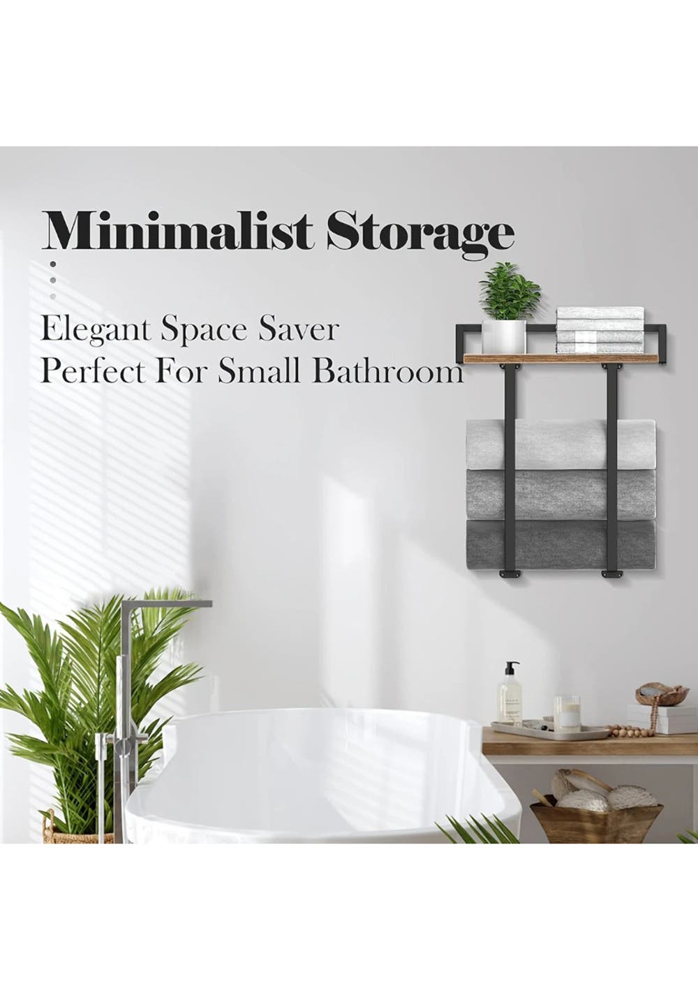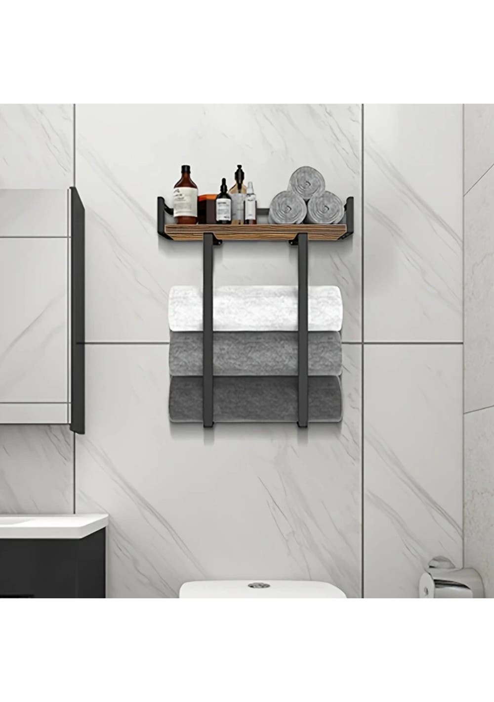A stylish and versatile wall-mounted towel rack with shelf, designed for optimal towel storage and aesthetic appeal in small or modern bathrooms.