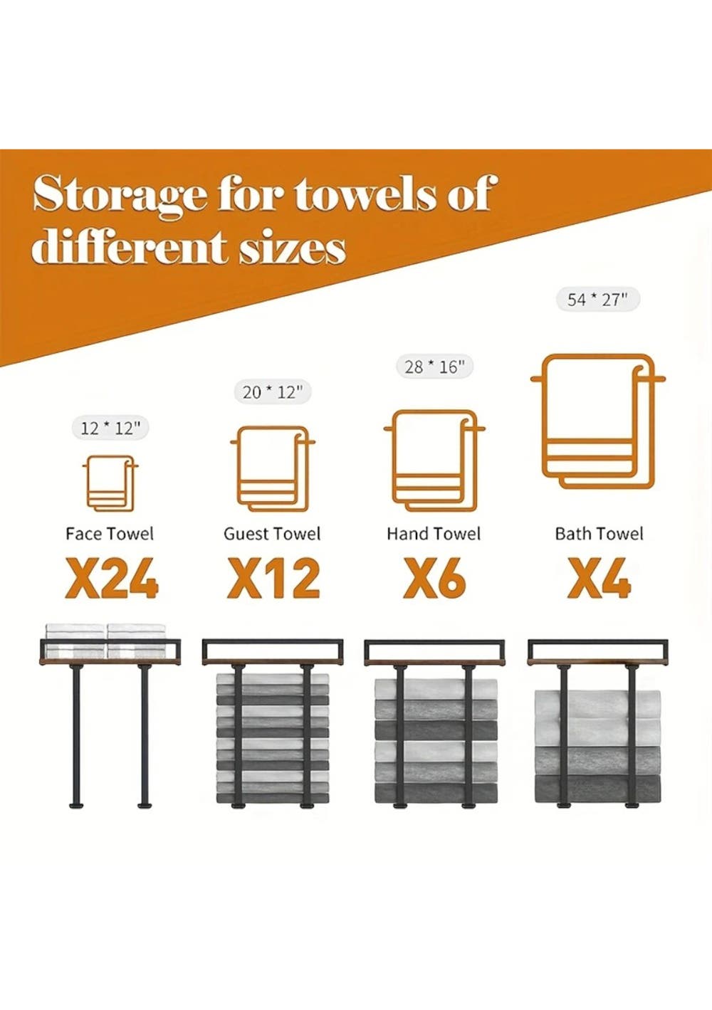 The wooden shelf accommodates toiletries or décor while storing up to 24 face towels, 12 guest towels, 6 hand towels, or 4 bath towels.
