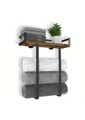 Elegant black frame with brown wood shelf complements modern and rustic bathroom styles.