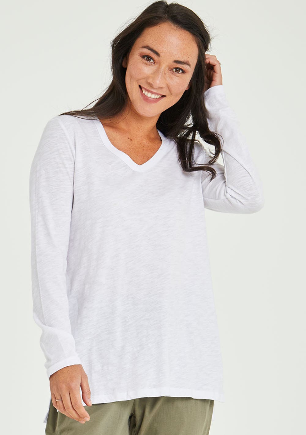 There's nothing like a classic V-neck with long sleeves that's great on its own or layered under a jacket. - Length 71cm (size 10) - Relaxed fit - 100% Cotton - Long sleeve - V-neck detail - High - low straight hem detail with side splits Fabric and Care: 100% Cotton Cool gentle machine wash, do not dry clean.