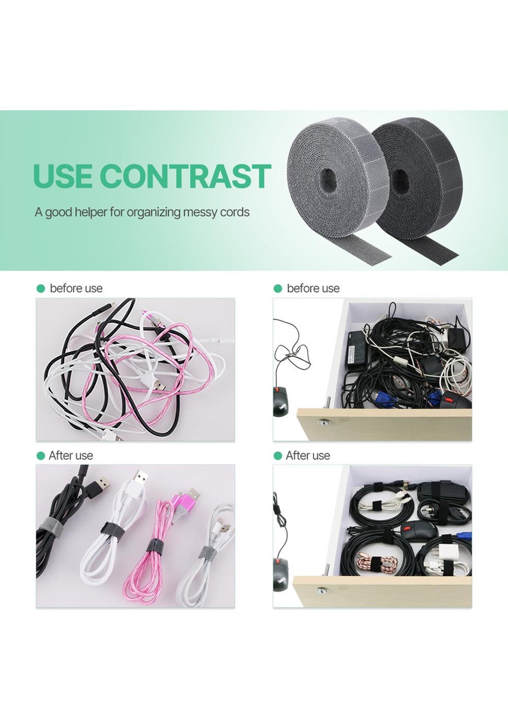 Versatile Use: Ideal for cord organization, wire management, and securing loose or extra-long cords to eliminate tripping hazards. Perfect for tidying up messy computer cables, mobile phone chargers, and other electronic accessories.