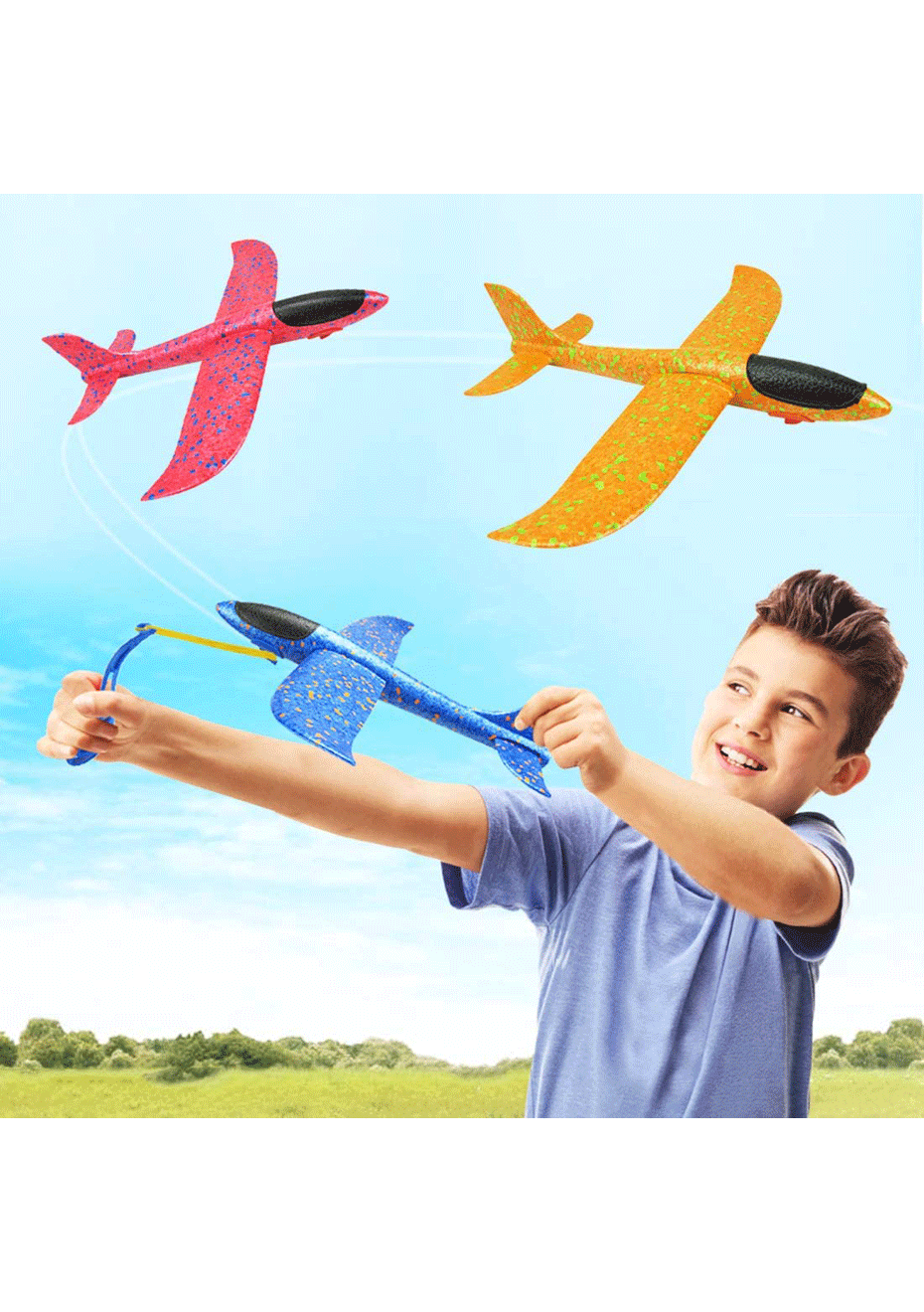What you get - you can get 3 pcs dual flight mode foam airplanes, include red, blue and yellow throwing airplanes. Each plane is 48 x 47 x 13 cm, attached with airplane launch slingshot.